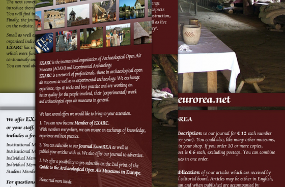 EXARC made a new publicity folder and printed 2,000 copies. It is described what EXARC is, including its recent ICOM affiliation. It explains the network EXARC forms of professionals in archaeological open-air museums and in experimental archaeology. Several offers are brought to attention like becoming a member and subscribing to our journal. The folder was sent to all archaeological open-air museums in Europe we know of (250) as well as to those in the States (150). The pricing of our offers is in Euro, Dollar and Pound.