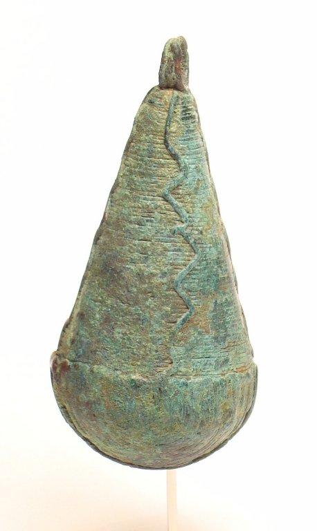 Fig 22. Smooth surface bell formed by flattening the wax cords. The suspension ring of this design shows the connection with the smelting channel. Also, there is evidence of a flaw in the smelting process that left one part of the opening filled with metal.