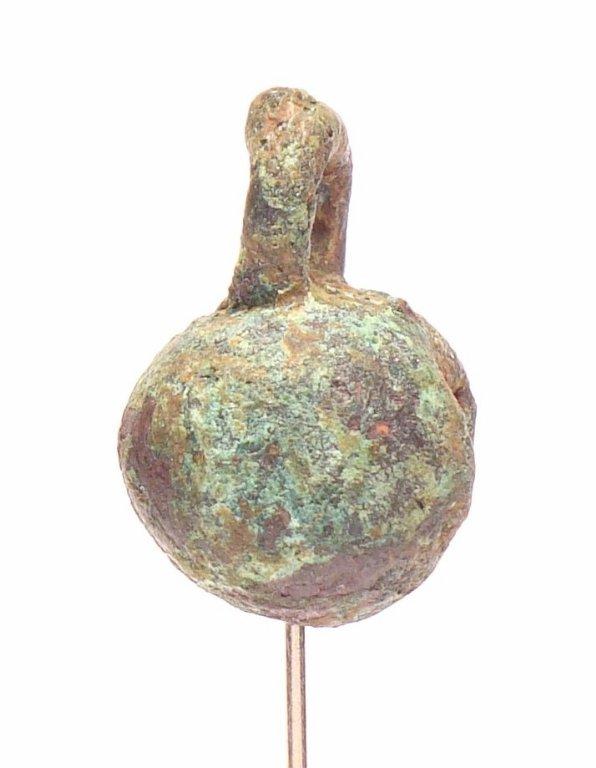 Note the smelting conduct adhering to the suspension ring and a thick rim that decorates the opening of the design.