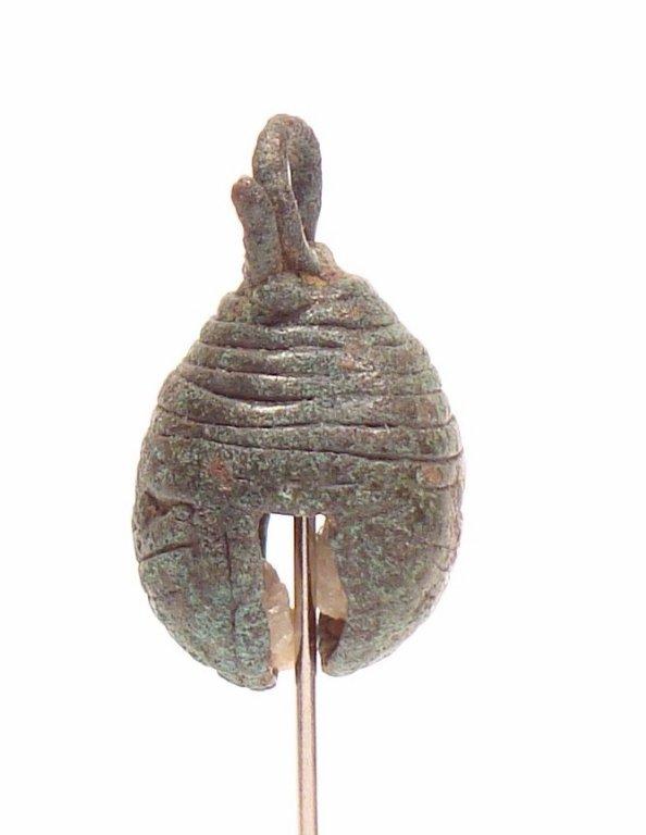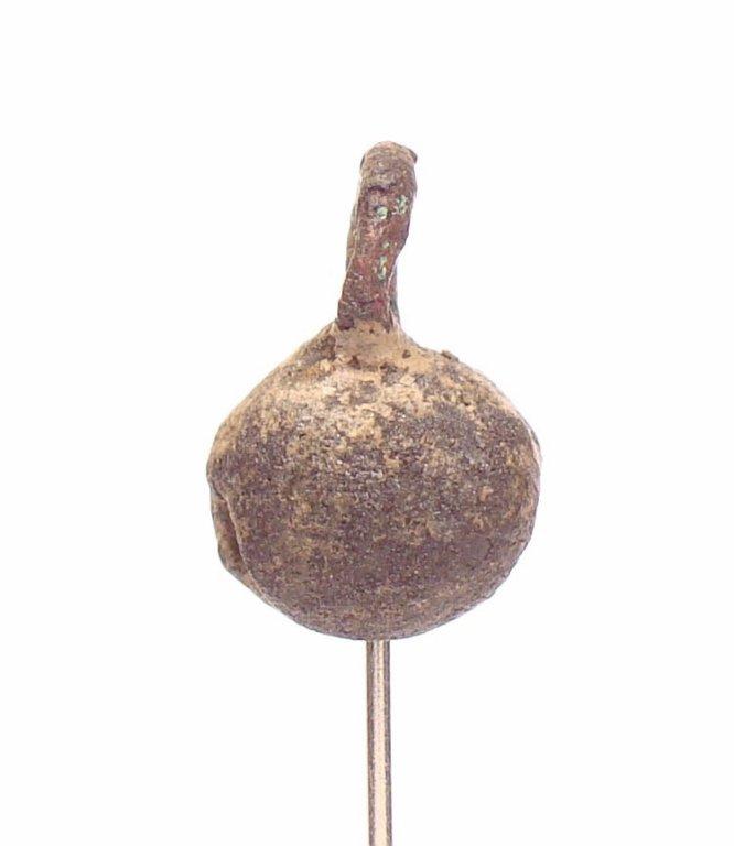 The spiral form of the suspension ring and the cord that descends from the base of that ring to the opening of the design are visible. This cord functioned as both a decorative element and a secondary smelting channel.