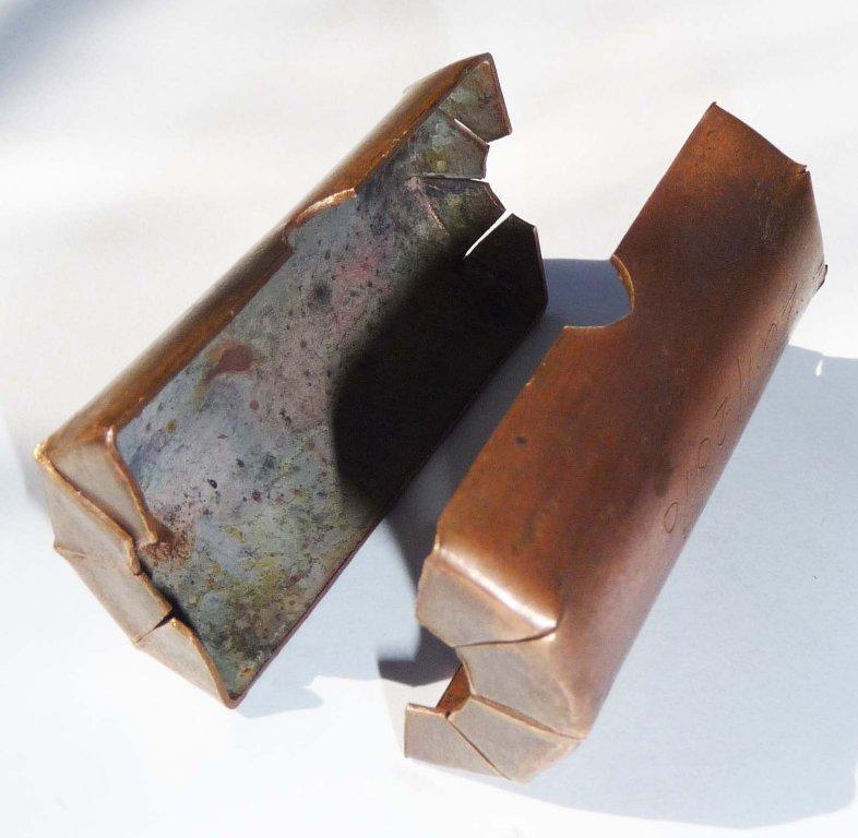 It is possible that the weights made from a double frustum could have been cast as a cylinder then hammered to shape. The mould shown in Figure 13 was made from a single piece of sheet copper. (See Figure 13, 14 and 15)