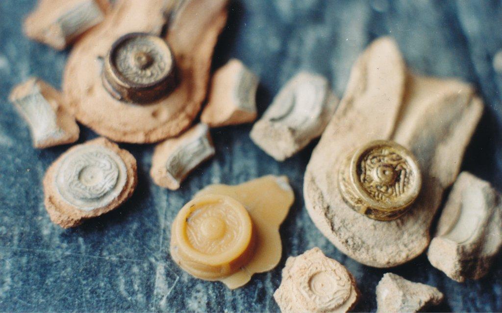 Apart from analyzing the styles of the buttons cast at Helgö, Lamm also studied the casting technologies. A method suggested in earlier discussions was the idea of casting in multi piece-moulds made by direct matrix-methods (Zachrisson 1960 & 1968). The interpretation of the Helgö materials did to a large extent lean on this idea, especially since the clasp button-moulds seemed to be broken in a characteristic pattern. Despite the ordinary cracking zone of the two piece-moulds, these moulds were broken by the sides of the buttons and around the upper side as well.
