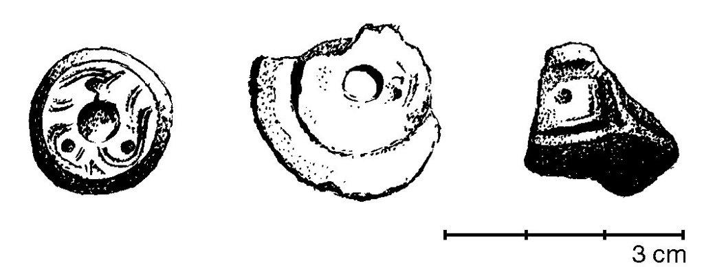 At the workshops at Helgö near Stockholm, 526 fragments of moulds for copper alloy clasp buttons were found, dating to the Migration Period. They were analysed by Kristina Lamm in the excavation report (Lamm 1972).