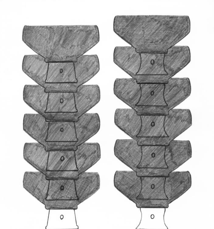 Kiln firing supports have such a remarkable variety in shape and size that PatitucciUggeri (1988, 624-632) was able to create a classification system, Groups I to IX are composed of stacking rings; Group X is composed of bell shaped kiln firing supports, Group XI is composed of sub-cylindrical supports and Group XII is made up of big, large and broad stacking rings (See Figures 3 and 4). In this classification supports from the Archaic Age, found in Marzabotto (Saronio1965, 385-416) and Adria (Bonomi,et al.1999, 212-235) are included. It is important to underline that in Spina two kiln firing supports have been found tied to the bottom of a grey ware bowl (PatitucciUggeri1984, 168), because this ceramic class is probably a derivation of Bucchero (Ciampoltrini 1990, 278; Malnati 1993, 47; Casini 2007, 242; Deriu 2009, 39-44); this confirms the use of kiln firing supports also for Bucchero. Moreover, supports were found with the grave goods of two women (graves 113 and 366) in the Spina necropolis (in Trebbia Valley). Their presence could indicate the work of the deceased during their lives. For this reason, I personally experienced the production of kiln firing supports using a potter's wheel.
