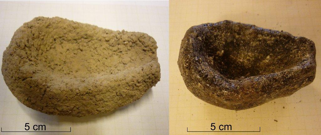 The crucibles found at Broåsen correspond well with the Bronze Age crucibles in southern Scandinavia in general. They are oval shaped, low and without a lid (See Figures 1 and 2). When studying the crucibles it is clear that they have, in most cases, been exposed to extensive heat from above. This indicates that they have been used in a workshop where the heat is intensified by an added oxygen flow coming from above. The reddish colour that is present inside and on top of the rim (See Figures 1 and 2) derives from copper-oxide coming from the copper-alloy in connection with the melting. The shape of the crucibles found at Broåsen does not vary much. However, the size does to some extent. The twenty refitted and whole crucibles were roughly divided into three approximate sizes: small (8 x 6cm), medium (10 x 6 cm) and large (13 x 8 cm).