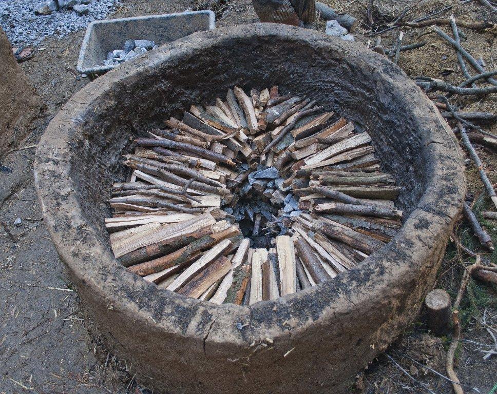 The design of the one-chamber kiln was based on the requirements of this type. The sunken part was created according to the archaeological find. The above ground cylindrical cover of 70 cm height connected directly to the sunken part. The cover widens conically on the inside. At the circumference of the cover at its base there were four drawing eyes to allow for regulation during the burning (See Figure 1).