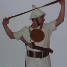 This method is applied to the equipment of my warrior, which I will describe from head to toe. The hat is made of five layers of raw linen, glued and sewn together making a cone. It is a rigid and enveloping headgear, which does not interfere with hearing or sight. It offers a limited protection against direct blows, but it can be useful in deadening weak blows not aimed directly at the head. It is an economical way to protect the head that was widespread among many Iron Age cultures such as the Etruscans, the Oscan and other Alpine ones (Eroi e regine – Piceni popolo d’Europa 2001, 27 and 33; Martinelli 2004, 25; Torelli 2000, 190; Homerus X 261, Hencken-Saulnier 1971, 27-28, 58, 85 Figure 58; Wary 1980, 44. Also compare archaeological findings such as Sardinian and Oscan votive figures stored at the Archaeological Museums in Cagliari, Sassari and Nocera Umbra) 1 .