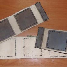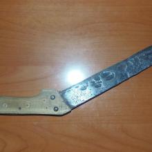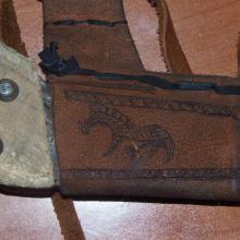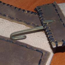 The last piece of defensive equipment is the war belt, a very popular piece of armour, which was perhaps distinctive of the warrior class (Lollini 1972, Maroni 1992, Martinelli 2004, Piceni popolo d’Europa 1999, Eroi e regine – Piceni popolo d’Europa 2001, di Bretschneider 2008). I made it by cutting a single strap of hard leather and reinforcing it by other squares of leather. The whole thing is quite sturdy and didn’t need to be hardened. The belt is fastened with a copper alloy hook. Though very few examples of leather belts have survived, dozens of similiar hooks, have been recovered from Picenian tombs dating to seventh-ninth century BC. The hook created for this study is based on one recently found in the Novilara necropolis.