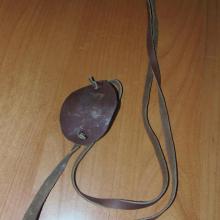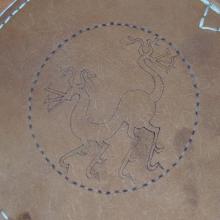 The kardiophilax is composed of a pectoral and a dorsal disc, one bigger than the other (Eroi e regine – Piceni popolo d’Europa 2001, 120-121, 240-243, 252-254; di Bretschneider 2008, 209-210). Each of them has been made by pasting together four layers of linen, then sewing it to a leather disc that was then hardened with boiled salted water. I replicated the suspension system that can be seen on the Guardiagrele Warrior and on the Capestrano Warrior (Eroi e regine – Piceni popolo d’Europa 2001, 240-243), using a leather strap and a smaller string. The decoration represents the chimera, which is typical of the ‘Paglieta’ kardiophilax, dating to the seventh-eighth century (Eroi e regine – Piceni popolo d’Europa 2001, 120-122, 253). It is the poor person’s version of the widespread bronze kardiophilax (Papi 1990). Tested against a rock thrown with a sling from a distance of 15 meters, the cuirass absorbed the impact, but it’s not clear what injuries the warrior would have sustained.