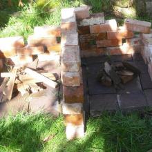 Several pyres were prepared, each surrounded by a small brick wall on three sides to protect it from wind and to minimise CO2 cross-contamination (See Figures 1 & 2). Animal remains obtained from local butchers, fish mongers and supermarkets were burned on different pyres fuelled with manufactured coal briquettes or dendrochronologically dated wood. The animal samples included a cow tibia, two pig ribs, a foot and a shoulder, two lamb legs, a whole chicken, and two fish vertebral columns. The pig foot and shoulder still retained all flesh and skin and were specially chosen, together with the whole chicken, to represent as closely as possible the remains of a recently deceased individual.