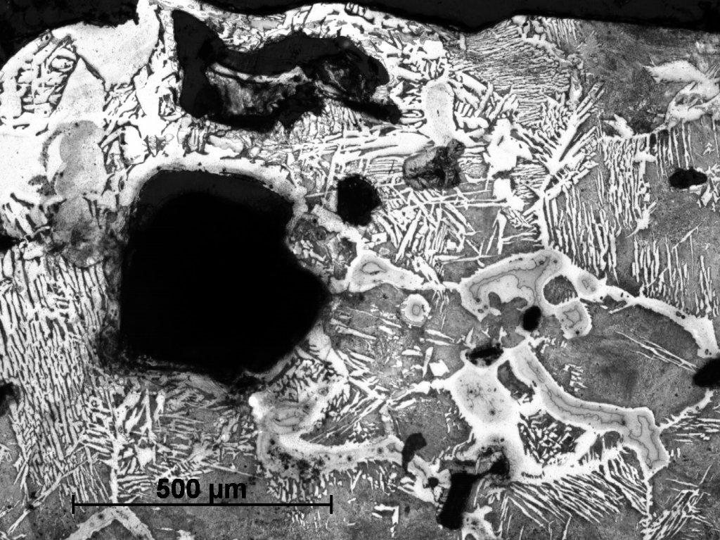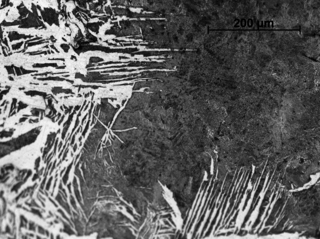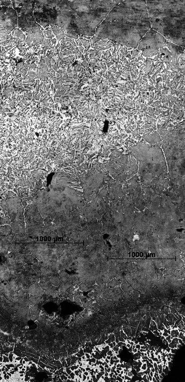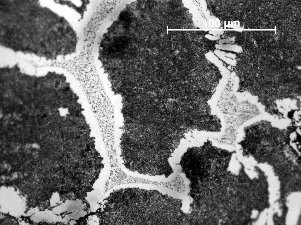 The most recent studies performed on the products of the process presented above revealed interesting mechanisms of this phenomenon (Wrona 2012). The structure observed on the cross-sections of ingots allows for the conclusion that this high degree of carburization was made possible by the partial melting of the batch. Metallographic observations of the samples’ surfaces present a diversity of existing structures and reveal an uneven degree of carburization. The highest concentration of carbon observed on the cross-section (with content significantly exceeding 1.5%) was located in the inner parts and arranged in layers with alternating bands of predominantly ferritic structure (See Figures 1, 5-6). The occurrence of such high carburized areas inside the ingots, combined with a very short (a few-minutes) duration of the process testify to local partial melting and strong carburizing of charge that falls to the bottom of the furnace creating a multi-layered clot. This thesis seems to be confirmed by the hypoeutectic structure observed in the cross-section of sample (See Figures 1-3) and the Widmanstätten ferrite educts (See Figures 4,6), which can be explained by local melting and overheating of steel. The coexistence in the adjacent space of hypereutectoid structures points to a further intensive diffusion of carbon to the surrounding areas (See Figures 1,3,7). The accurate characterization of changes in the boundaries of the two-phase coexistence region of the liquid and austenite in the presence of the high dynamics of transitions caused by changing carbon content and periodic temperature variations is not possible at the present time and requires further research and verifications. In addition to that highly carburized zone, there are also areas of the virtually unchanged, ferrite-pearlitic structure of the starting material (See Figure 5).