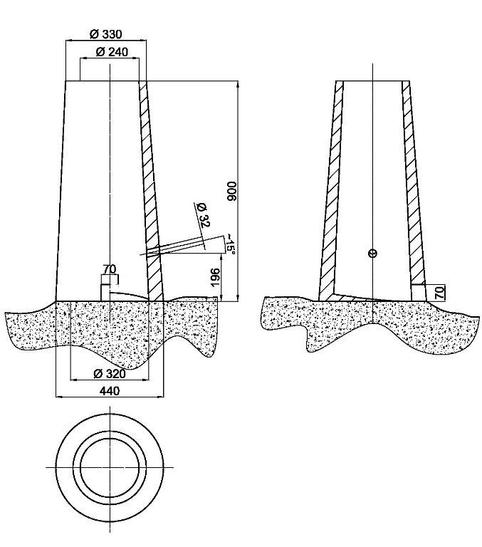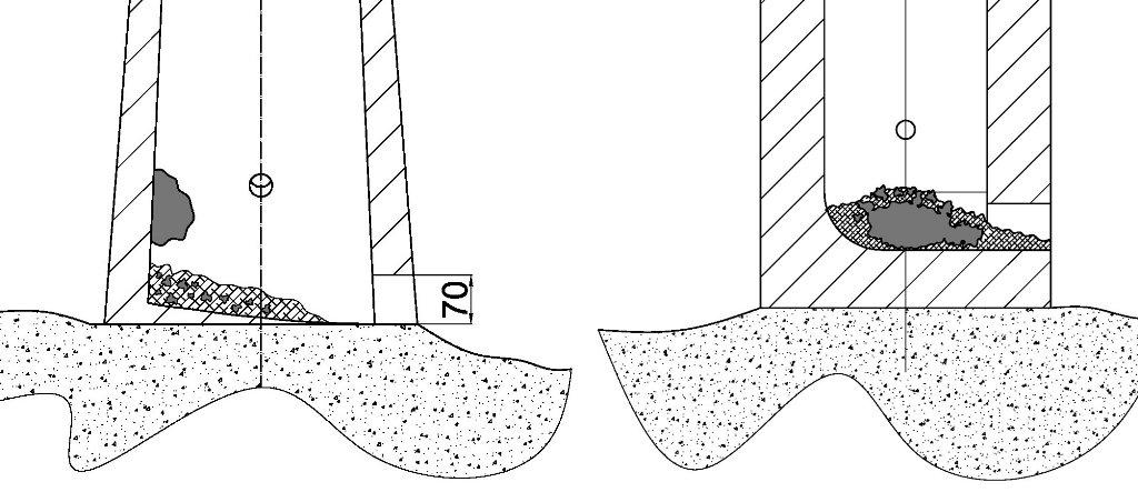 Experiment one, carried out on 15 June 2012, was conducted in thin-walled, free-standing shaft furnace on an oval plan, modelled on the ancient furnace from Loděnice, dated to the third to fourth centuries AD (Pleiner 2000, 175). It was built of clay mixed with straw and gravel on thin clay film (≈ 1 cm), isolating it from the substrate. The internal diameter of furnace was 30 x 32 cm on the bottom and narrowed to 24 cm at the top of the shaft. The wall thickness was about 6-7 cm in lower parts. The ore used in the process was a poor-quality and high silica content ‘ferruginous-sand’ gathered from the fields beneath the Starachowice. It was double roasted on wooden piles with the total time estimated at about ten hours. A drain hole the size of 7 x 7 cm was placed on the base of the furnace. The blowing hole had an internal diameter of 35 mm and was located 20 cm above the furnace bottom with the inclination angle of some 15 degrees (See Figure 8). It was powered by the two alternately blowing, large hand-bellows, each of about 70-80 l capacity, which made it possible to maintain a continuous draft for almost the entire duration of process (with a few breaks in order to make necessary repairs to the shaft). Bellows nozzles were combined into one by a wooden tee. The tip of the tuyère was not connected with the furnace and was distanced at about 2-3 cm from the wall. The charcoal used was commercially made beech and was crushed and selected to a size range of 30-50 mm.