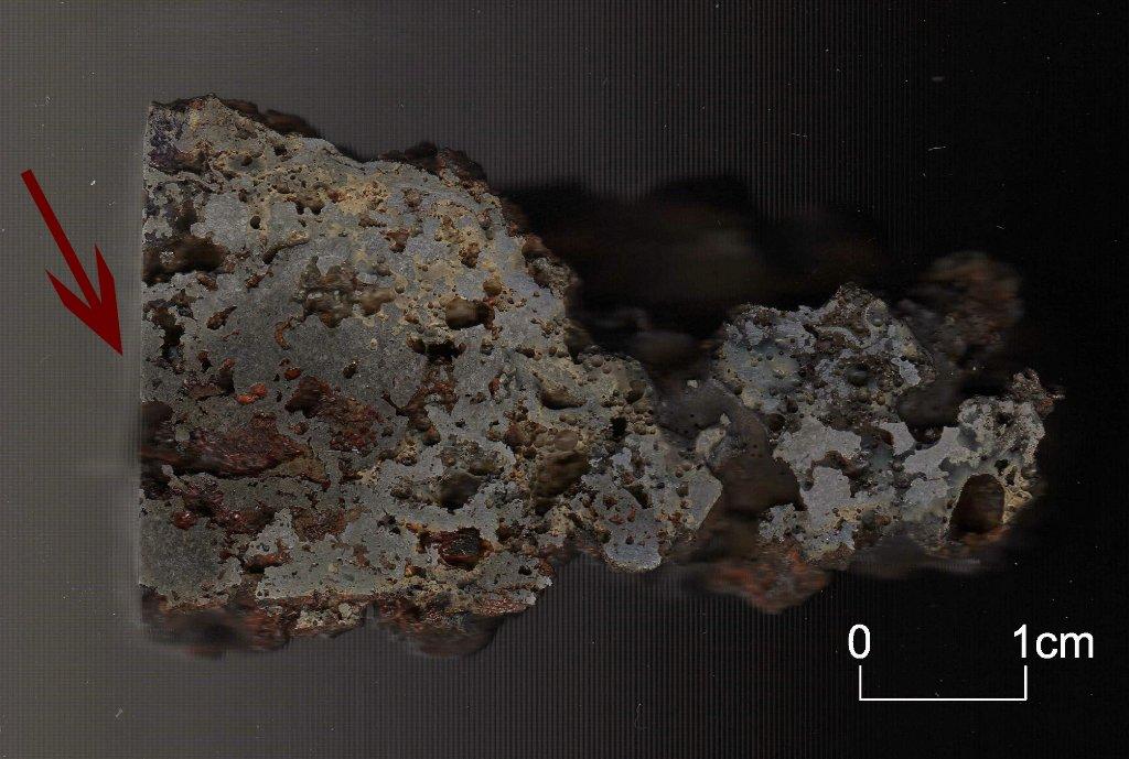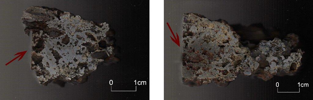 In contrast to the bloom from experiment 1, the iron obtained in this process was a dense and homogeneous lump with only a few fragments not integrated with the whole mass. The voids occurring on the cross-section derived most likely from fragments of burnt charcoal or gas bubbles trapped in the mass of iron. Three samples were taken to analyse: two from the main iron mass (See Figure 11) and the third one from one of the non-integrated parts (See Figure 12).