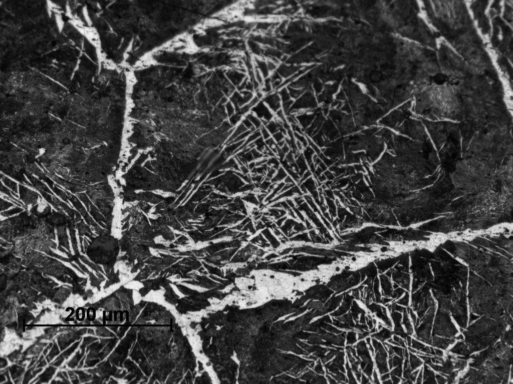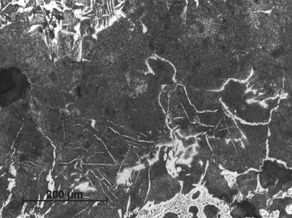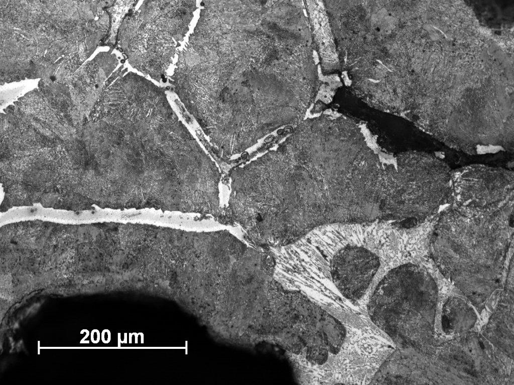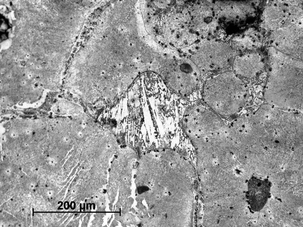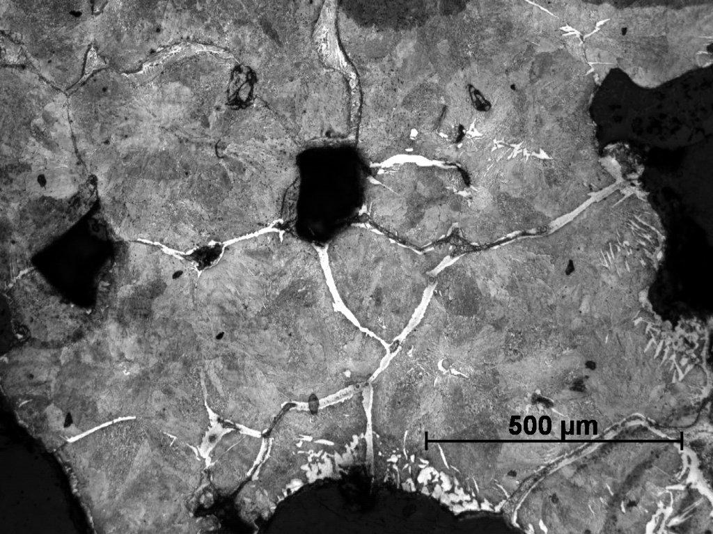 Sample Number 1.2 has a more heterogeneous structure. The dominating phase is pearlite, but in some parts a ferrite network can be observed on the pearlitic background (See Figure 20). Ferritic educts in Widmanstätten orientation are mostly located on the edges of the sample (See Figure 21). Moreover, similarly as in the sample Number 1.1 we can observe plenty of fusion spots with phosphide eutectic or ledeburite content (See Figure 22-24). A primary segregation of elements can be also observed in some ferrite educts (See Figure 23,25).
