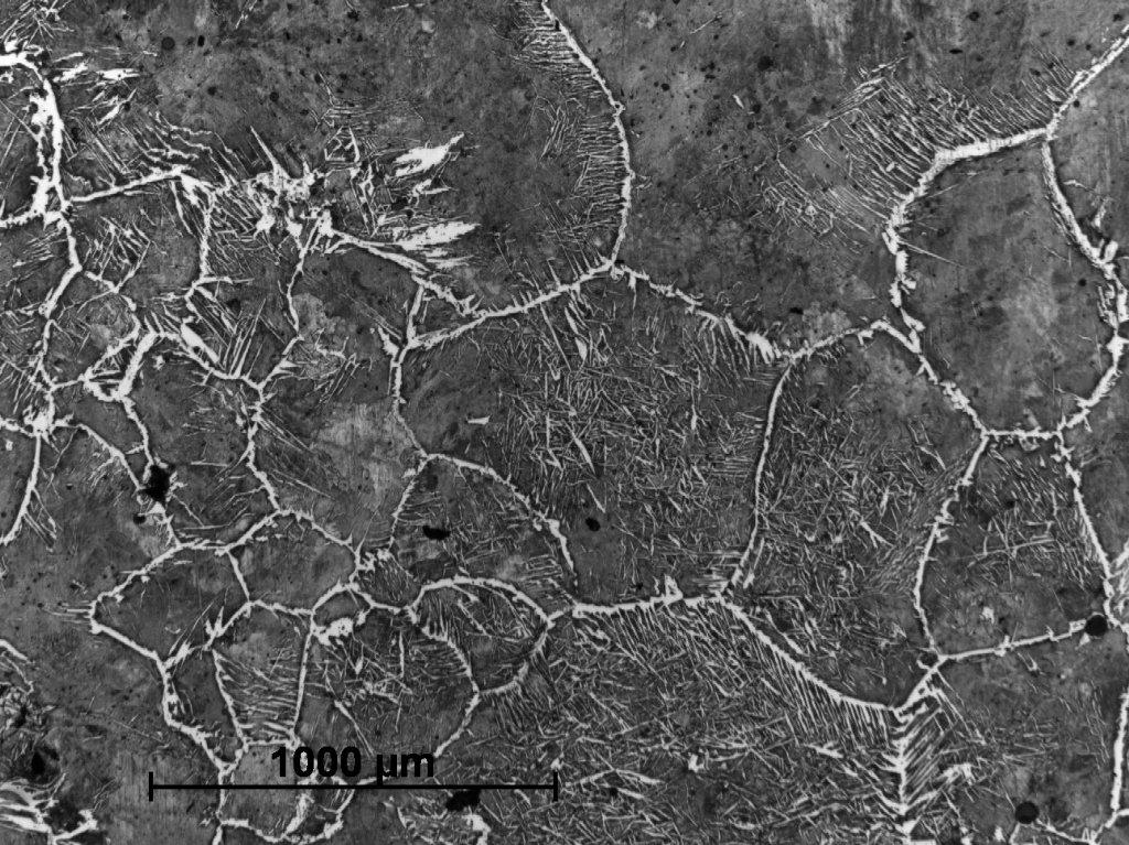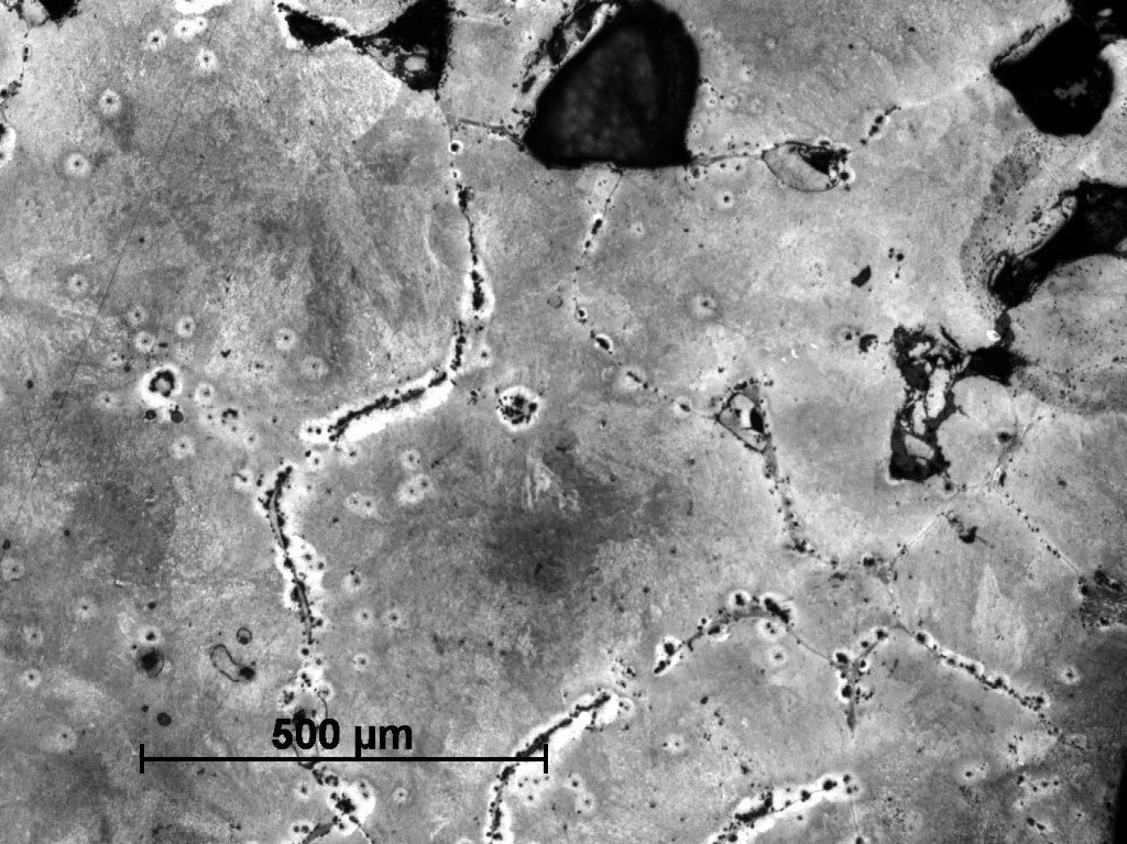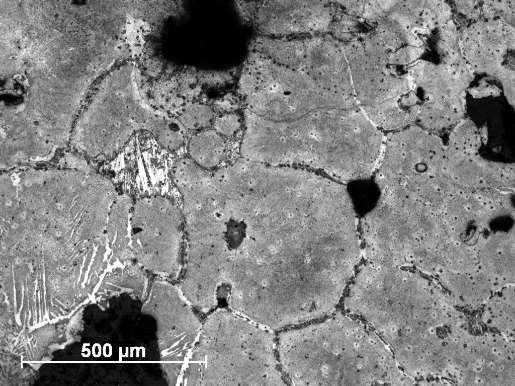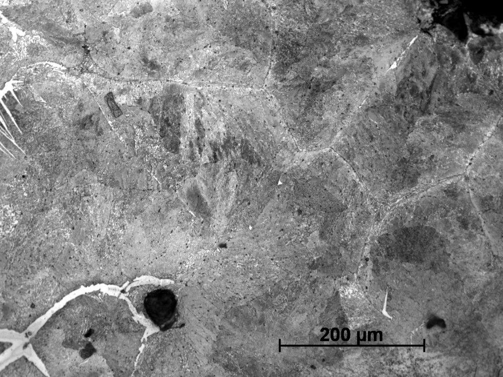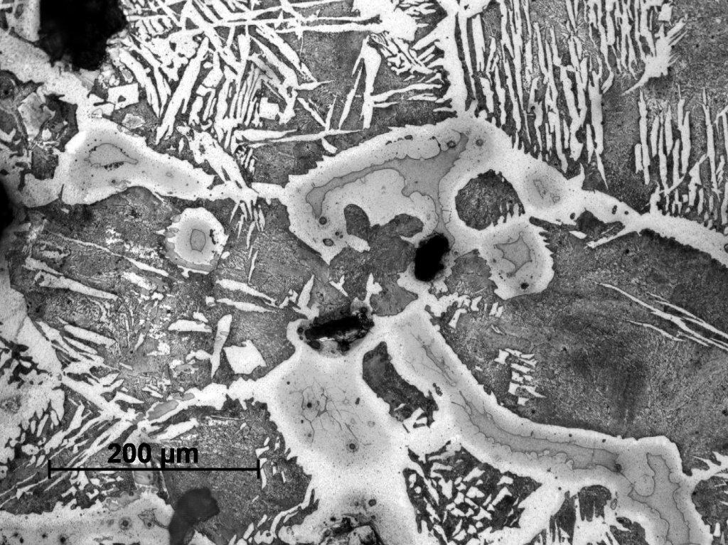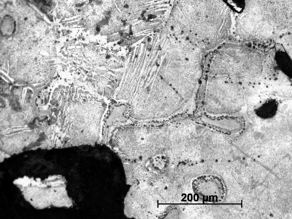 Sample Number 1.2 has a more heterogeneous structure. The dominating phase is pearlite, but in some parts a ferrite network can be observed on the pearlitic background (See Figure 20). Ferritic educts in Widmanstätten orientation are mostly located on the edges of the sample (See Figure 21). Moreover, similarly as in the sample Number 1.1 we can observe plenty of fusion spots with phosphide eutectic or ledeburite content (See Figure 22-24). A primary segregation of elements can be also observed in some ferrite educts (See Figure 23,25).