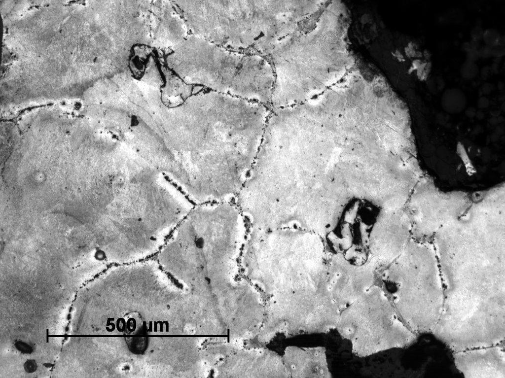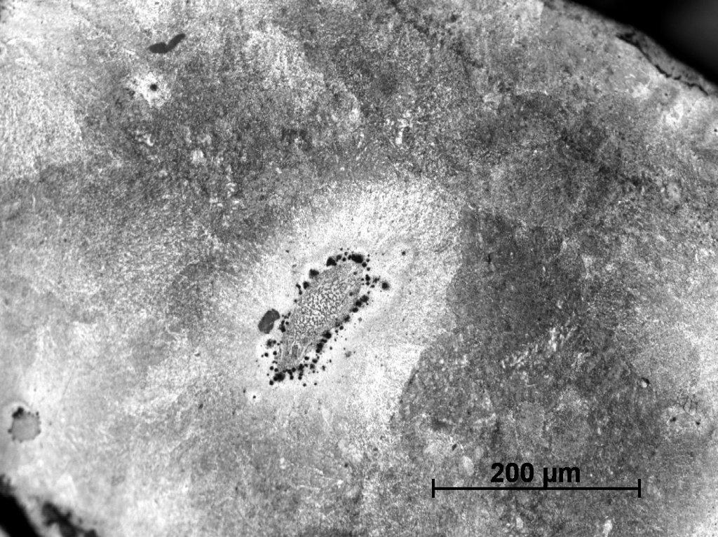 Sample Number 1.1 has a mostly homogeneous structure of pearlite with numerous oxide inclusions and many areas of transformed ledeburite (See Figure 14). Very few areas showed the local occurrence of ferrite-pearlitic structures usually associated with the fusion spots—perhaps caused by the presence of phosphide eutectic (See Figure 15). The fusion spots occur also in pearlitic areas (See Figures 16,18 and 19). They attracting carbon from adjacent spaces and creating a characteristic band on the grain boundaries. Besides, numerous fusions with ledeburite structure were observed on the whole cross-section of sample (See Figure 17).