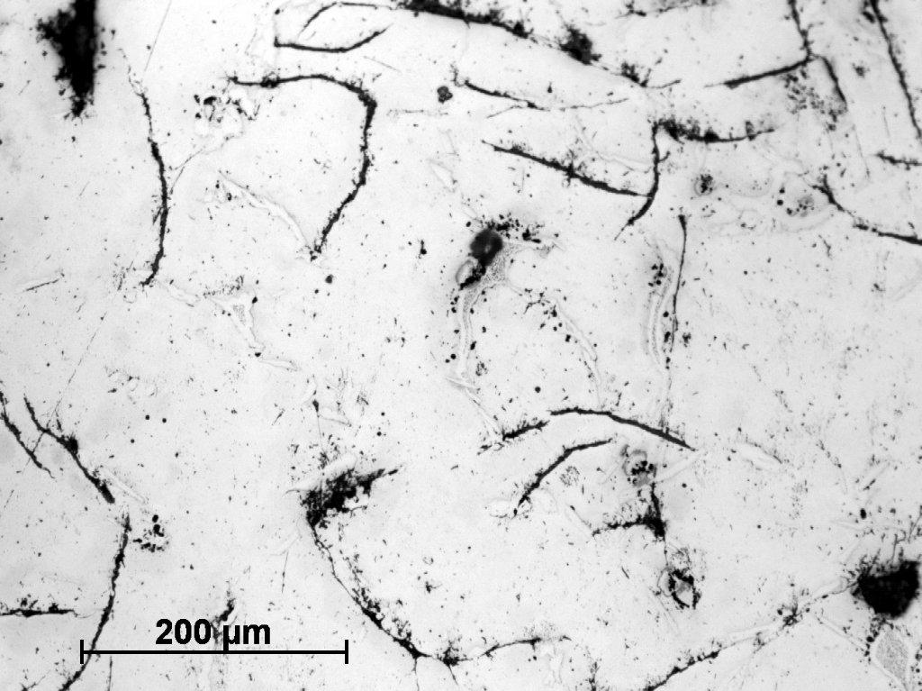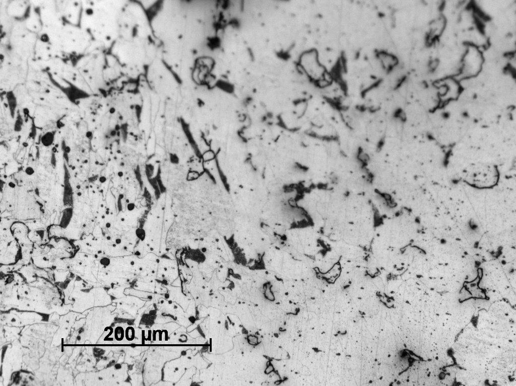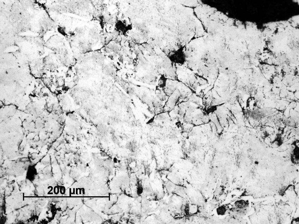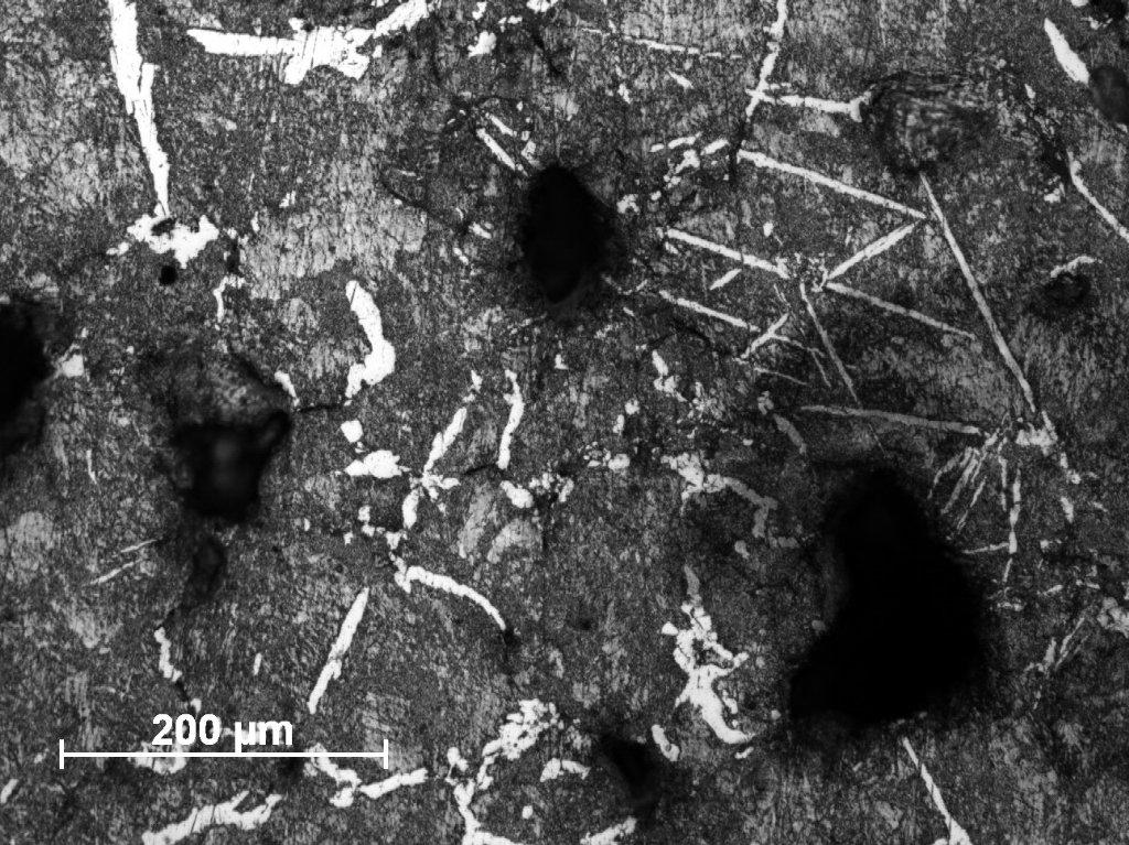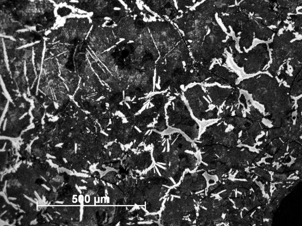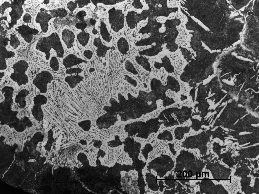 Sample Number 2.1 was taken from the lower part of 'bloom'. It consisted of a homogeneous structure of pearlitic grey cast iron with only minor ferritic educts, mostly on the grain boundaries (See Figure 26). In some areas the needle-shaped ferrite can be also observed (See Figure 27). The graphite flakes are long, relatively thin and slightly curved in some areas. They demonstrate an uneven distribution in metal. The second sample taken from the top of the 'bloom' and labelled as Number 2.2, has a similar structure, but with this difference that there are very large numbers of phosphide eutectic, which occurred in the whole element (See Figures 28-29). The last sample (Number 2.3) is characterized by pearlite-ferritic matrix and multitude of phosphide eutectic, similar to sample Number 2.2. Also the needle-shaped ferrite also occurs much more frequently than previously (See Figures 30-31).