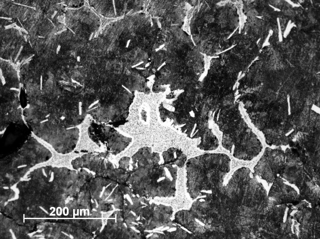 The structures presented above are the result of melting and slow cooling of an alloy in the carburizing atmosphere with a large content of carbon monoxide. It is interesting that, despite such a low air rate, it was possible to create the above structure. Possibly the small size of the furnace chamber, thick walls and low but constant air flow, which does not cool the charge, created appropriate conditions for the appearance of the liquid phase. Perhaps the phosphide eutectic, which has low melting point, also contributed to this. Usually the production of grey cast iron is caused by slow cooling, allowing the formation of the graphite flakes. However, due to the course of the process described above, it is clear that it cannot explain the occurrence of this phenomenon. It seems that the cause of graphitization here may be the silica- and phosphorus-rich ore composition. Both elements are known as graphitizing factors, favouring the formation of grey cast iron (Crew, et al. 2011, p.251). The high phosphorus content is confirmed by multitudes of phosphide eutectic occurring virtually on the entire volume of metal.