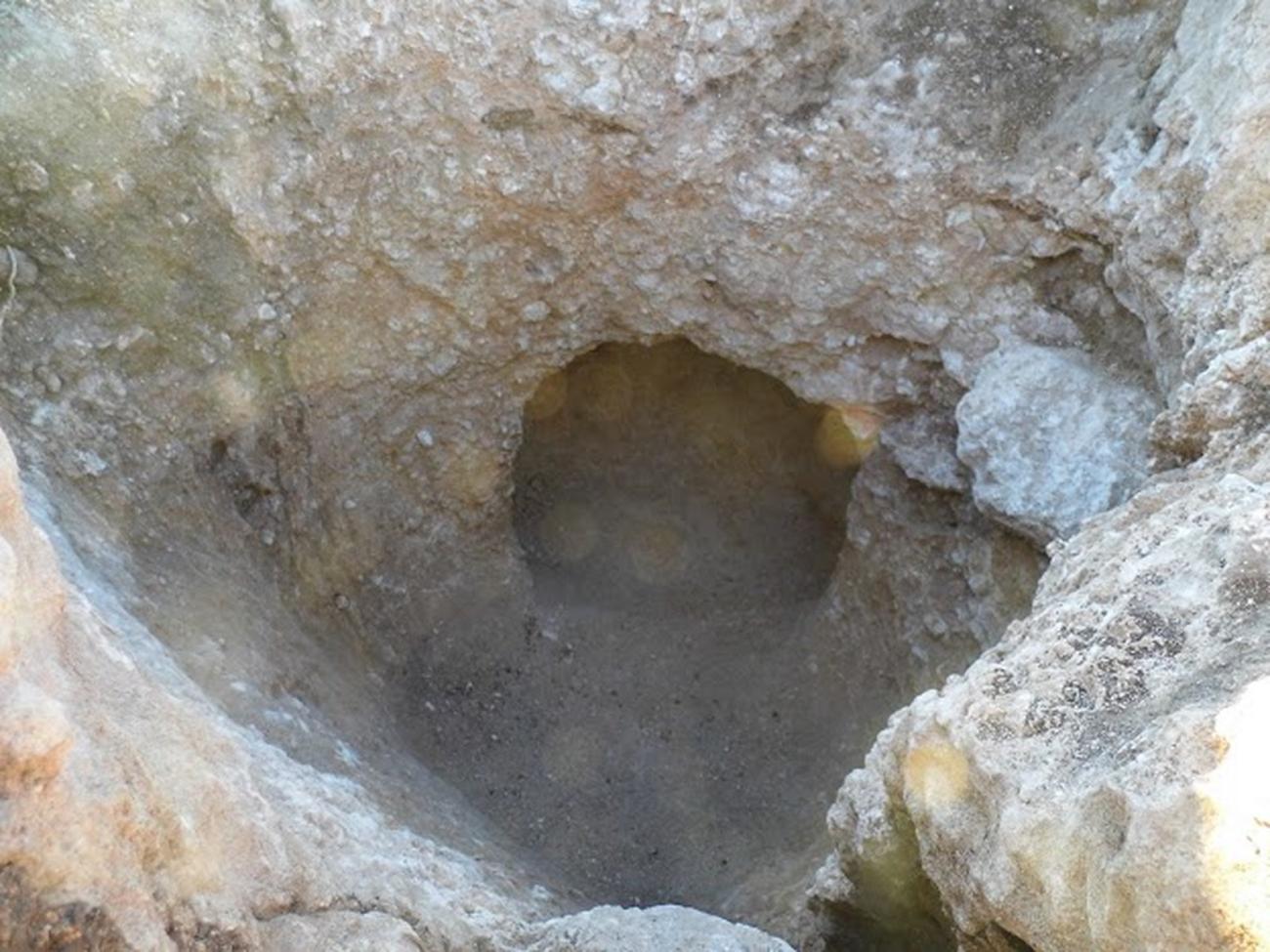 Day 1: The starting point for the carving of the shaft was chosen, a cavity full of erosion soil and small stones in the Nari layer. The first activity was to clean the cavity of soil and stones and to prepare the point for the shaft carving. This work took circa two hours, after which the rounded shape of the shaft was found to be ½ m in diameter. The carving of the shaft was conducted by one worker, using a large pick-axe. The other two workers cleared the waste. The workers changed their roles from time to time due to physical reasons; the hard work of carving in the hard Nari layer and the narrow space within the created shaft. In the two hours of work, only 0.30 m of rock were carved.