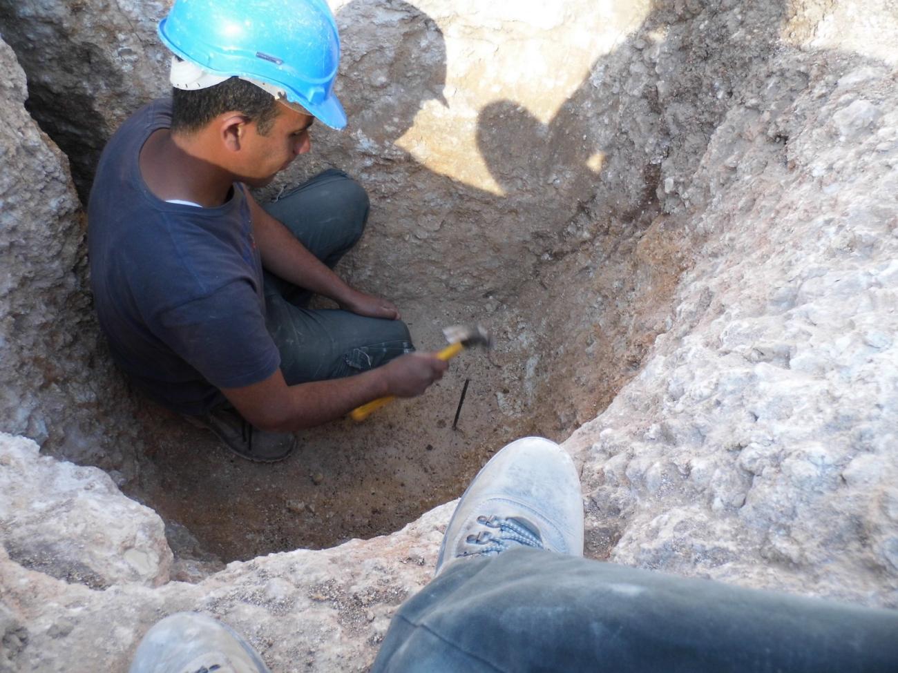 The experiment took place in nine days between the 9-20 February 2014. Three workers were employed, working for more or less eight hours a day, with half an hour break for rest and breakfast. The workers used hand tools that are common in archaeological excavations. For carving the rock they used large and small pick-axes (all pick-axes had wooden handles and iron blades, we deliberately used worn-out tools with dull cutting edges in order to create the closest comparison to ancient tools, though we had no bronze or flint tools for the task) and in order to clean the rock waste they used shovels, spades and buckets. The following account documents each day of work and the various issues that accompanied it (See Figures 4-10).