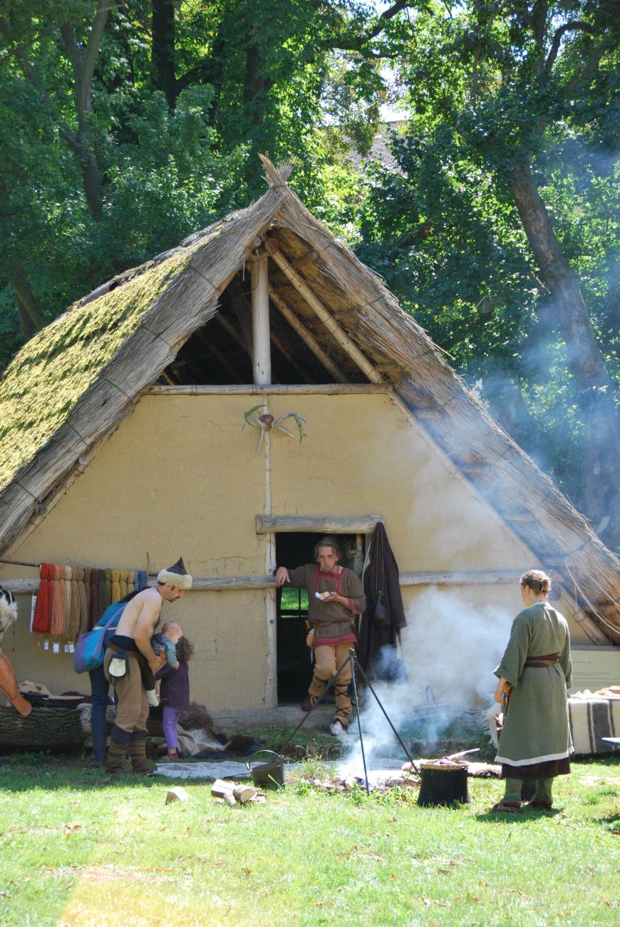 During the construction work, in 2012 the frame of the longhouse model was built, this was covered with a roof made of reeds, and the walls were also sealed with wattle and plastered with a combination of loess loam, sand and chopped straw. In the spring of 2013 the interior of the building was also structured with two partition walls, in the front area an intermediate ceiling for storing goods was added, and the door and window areas were designed. The work was completed by VIAS in mid-April 2013. Archaeological researchers assume that the three-part division of the interior of Linear Pottery culture houses, which can be seen in many house ground plans, reflects areas of different use. In the rear area, the walls were particularly sturdy thanks to posts being positioned directly next to each other. Maybe people slept in this particularly protected area or stored especially valuable goods there?This part of the building might also have had holy significance to some extent. In the middle section the distances between the load-bearing rows of transverse posts are the largest, meaning the biggest areas without posts would have been here. This middle section is usually interpreted as a central living and activity area that might also have been equipped with a cooking area and oven. The double post alignments of the front part of the house are seen as a substructure for an intermediate floor where people would have stored provisions for winter. The ground-level area might have been used as a work area here.