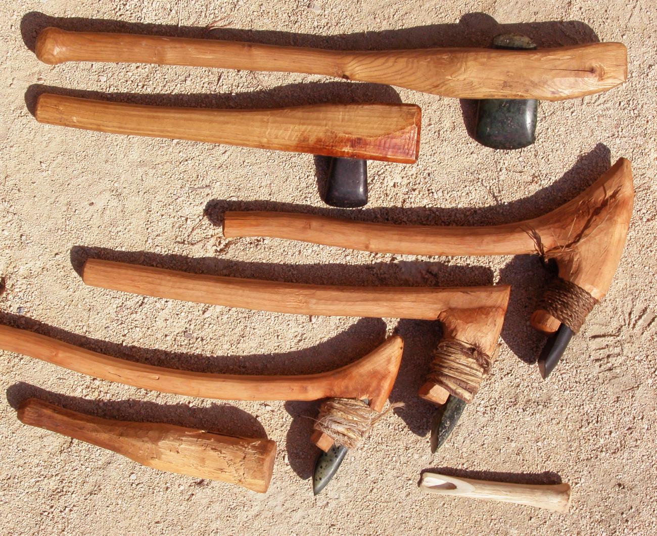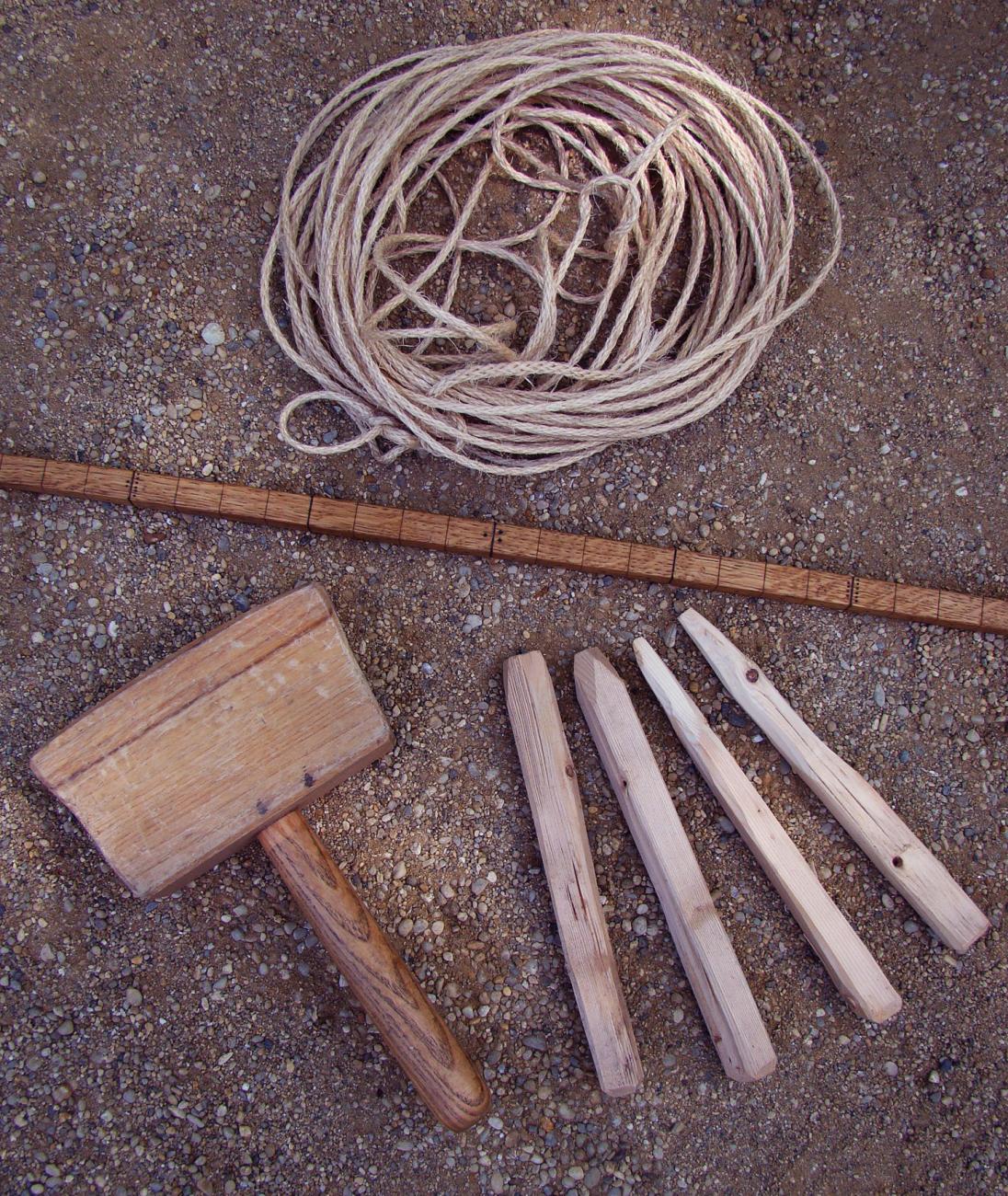The first farmers had their own developed range of tools for woodworking, and here adze forms played a key role. They were able to clear primeval forests and also chop down trunks with diameters of more than 1 m, cut them and, if necessary, split them purposefully into timbers of all sizes. With narrow and high adzes they were able to shape many different construction timbers from the obtained pieces of wood, and with narrow and broad forms the surface of these could be finely smoothed. There were also so-called setting wedges with rather small mounting holes that were most likely used to systematically split horizontal timber. The known tool set also included chisels made of bone which were used to create notches and slits, bone awls for marking, and also flint blades for smoothing surfaces. Yardsticks might also have already been used for transferring distances. With practical experiments it became clear to the archaeologists that cords or ropes must have been indispensable, not only for tying but also as important tools which enabled the people to mark out straight rows or measure and transfer distances. In some work steps it seemed worthwhile for the experimental archaeologists at VIAS to work with a kind of âdrawing floorâ to be able to precisely coordinate positions and lengths of timbers with each other in the sense of âfield measurementsâ.