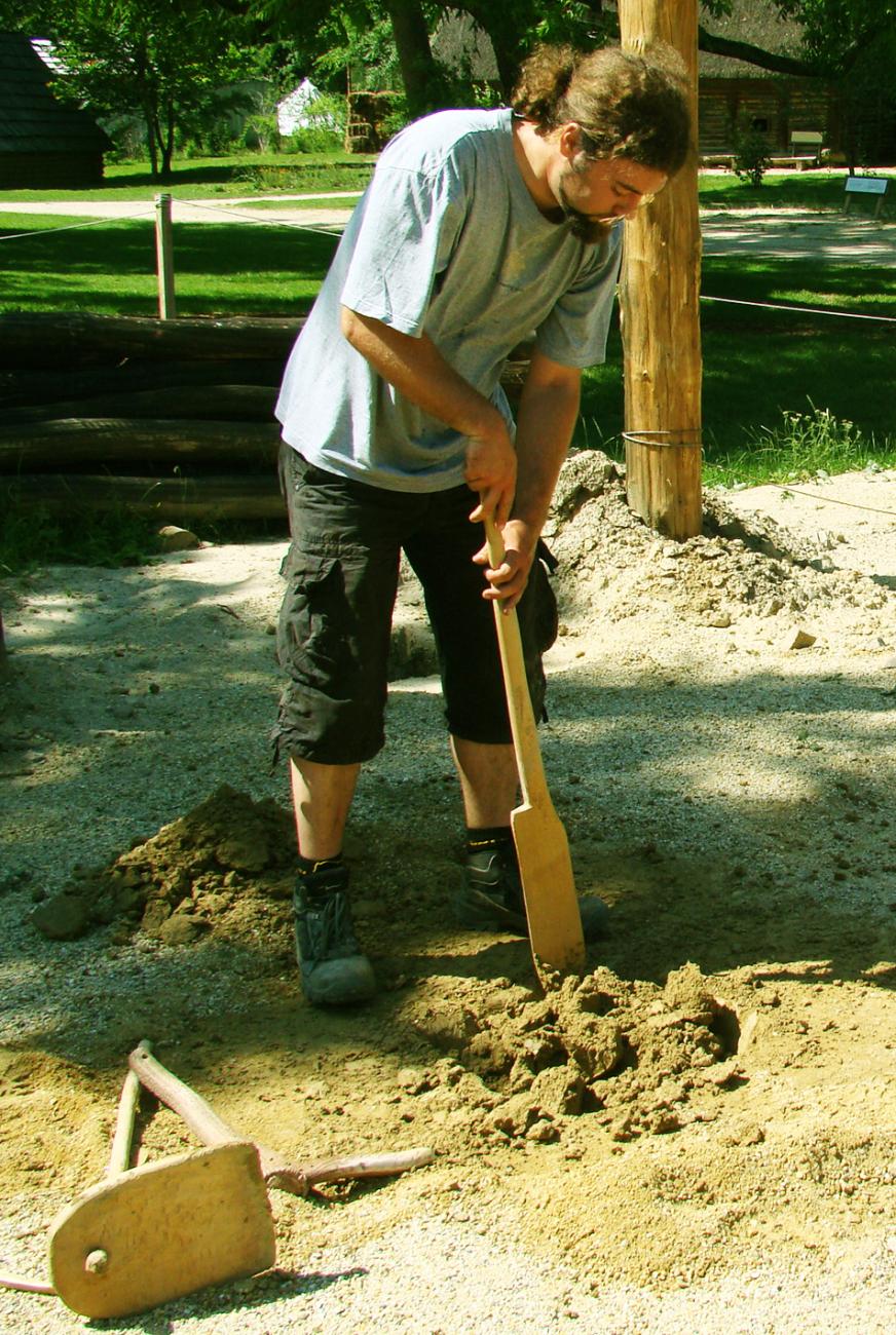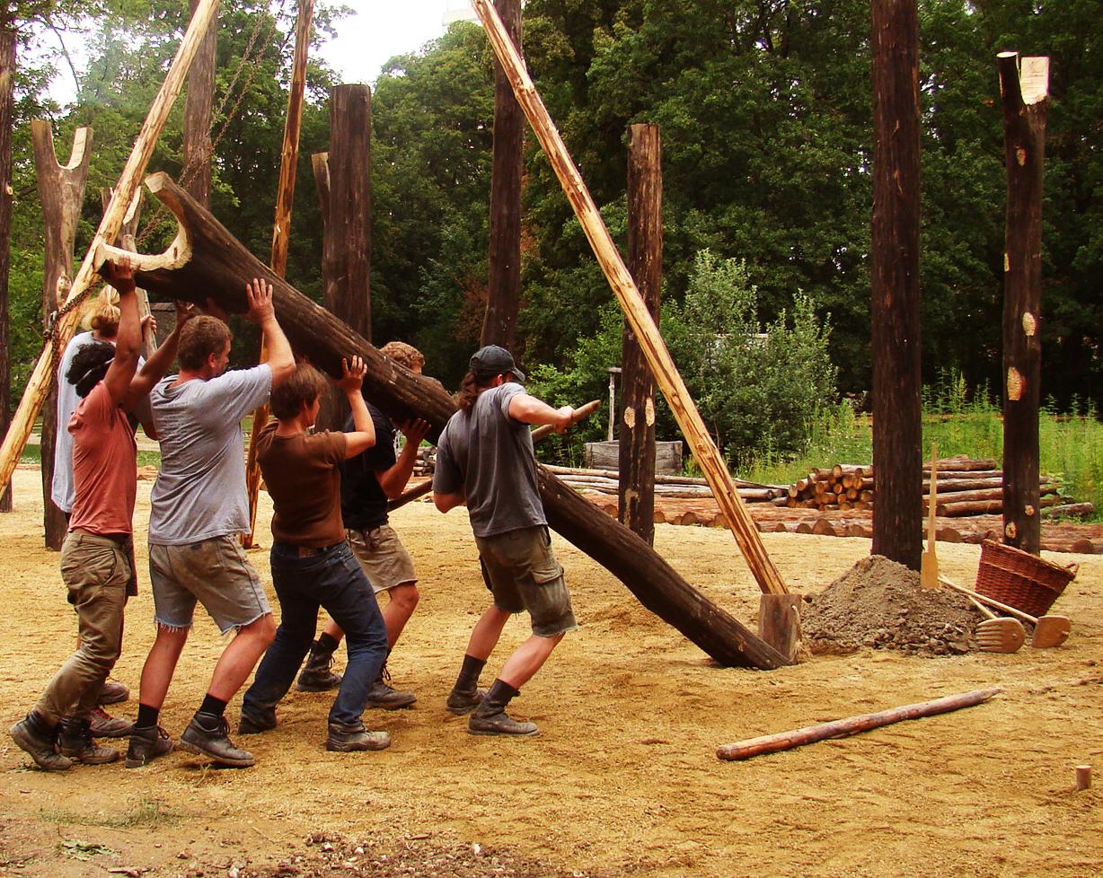 Before the practical construction work, VIAS carried out extensive research on the status of Linear Pottery culture wood technology. From settlement and grave finds we know that sharpened stone blades and also tools made of bone were, in all probability, used for woodworking. Preserved building and construction timbers from this period have so far come solely from Linear Pottery culture well finds which indicate astonishingly highly developed wood technology. On the basis of the house grand plan from Schwechat with its individual construction features, a house model needed to be designed which did justice both to the knowledge of the tools from this period and also the wood joining techniques known from the wells.