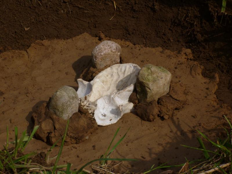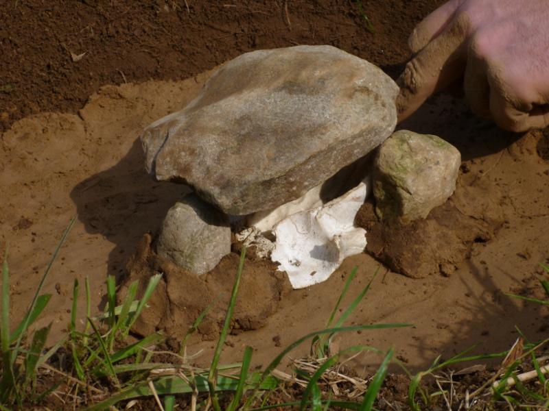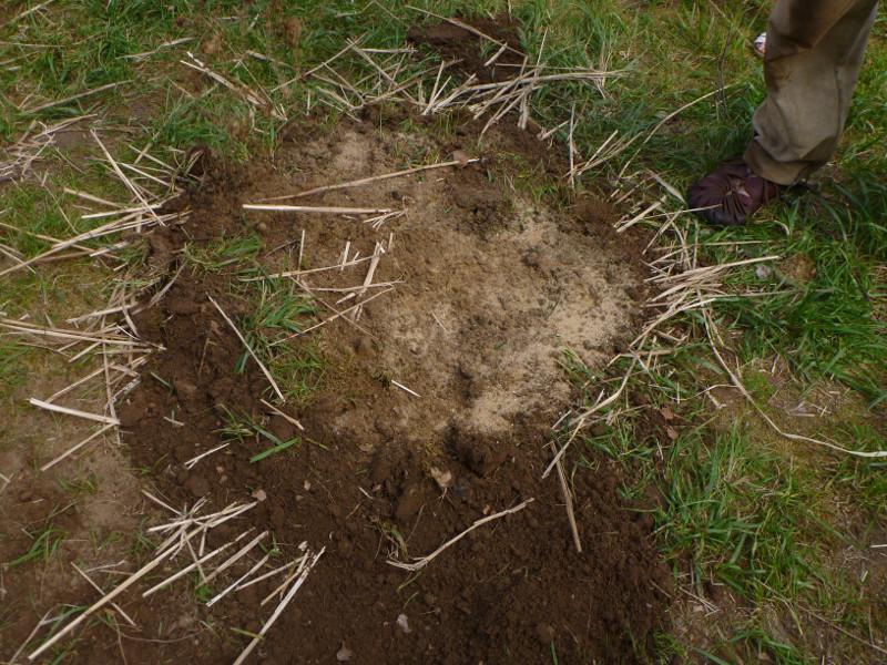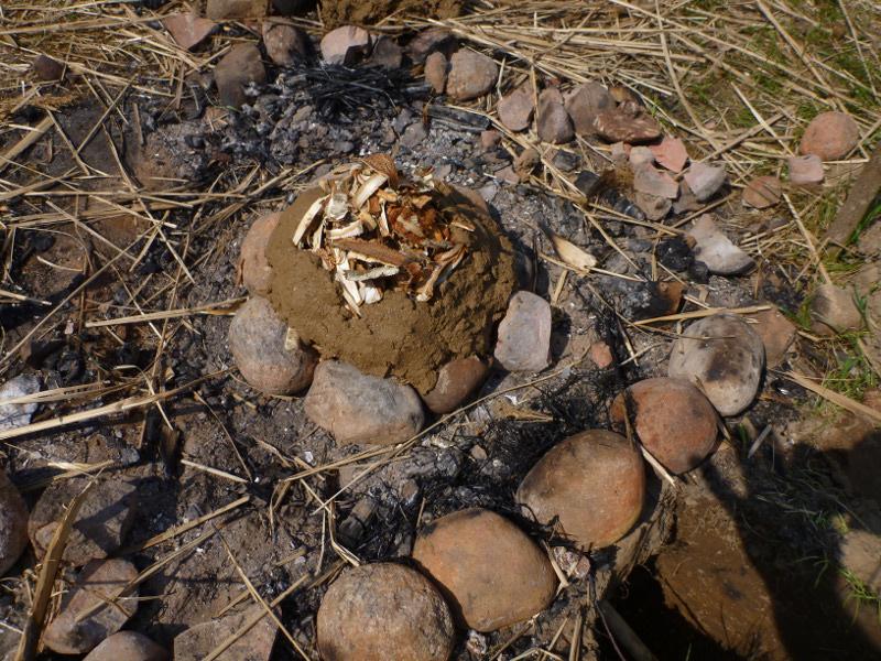 Birch bark was placed on top of the deck stone and a bit around it in a thick layer. To stabilise the bark, the space between the bark and the sides of the pit was filled with dry grass and little twigs. Then everything was covered with a layer of dry grass and twigs, filling the entire pit up to ground level. A thin layer of sand was put on top, then an approximately 2 cm thick layer of clay, mud and sand mixture to seal the whole pit completely.
