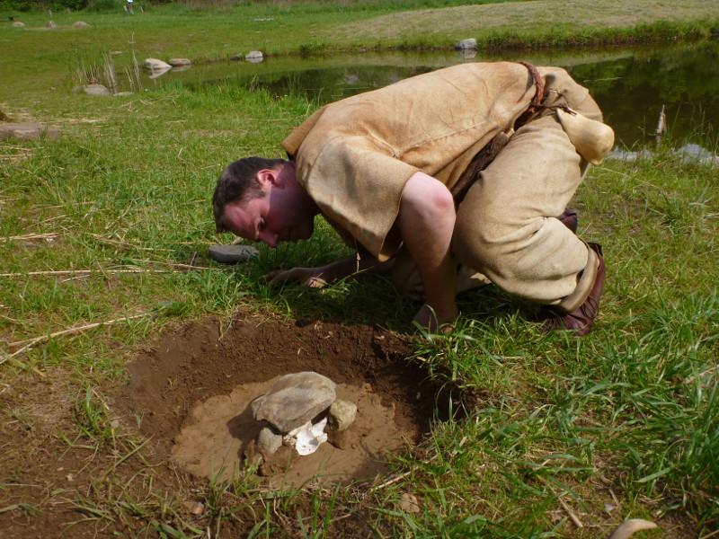 Marco dug a shallow pit in the ground, about 30 cm deep and about 60 cm in diameter. In the centre he dug a little groove for the vessel. The vessel was either a little clay pot, a can, or in one case a cut open part of a deer skull. The latter was used to see if a skull is useful to collect tar and even produce pitch with it, as clay pots and cans were most likely not invented yet during most of the hunter gatherer periods. Then the bottom and the sides of the pit were smeared with wet clay to prevent tar disappearing into the ground.
