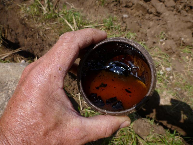 - The remains of the clay/mud/sand layer after the firing process are quite soft and brittle when taken in the hand and squeezed a bit. This means that the remains of the oven are likely to have disappeared within a year or two. It will look just like any normal fireplace. Thus recognising a pitch distillation location in an archaeological context after thousands of years will be extremely difficult, if not impossible. There might be some remaining microscopic tar traces in the sand, but there needs to be some more investigation done on this subject. We did one experiment without any pipe or pot under the oven, but a 3 cm thick layer of sand on the bottom to see if the tar will be visible in the sand afterwards, but we could not find any traces of it at the end.