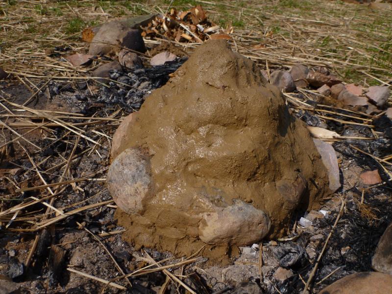 - The sealing layer around the birch bark needs to consist of a high percentage of mud and sand and just a very small amount of fine clay. It must also be very thin (between 2 - 3 cm only) in order to let the heat enter the interior. I had done an experiment a year earlier with a thick layer of about 8 - 10 cm of mud, which was far too thick. Although I had fired this one for several hours, the bark inside was not burnt at all!