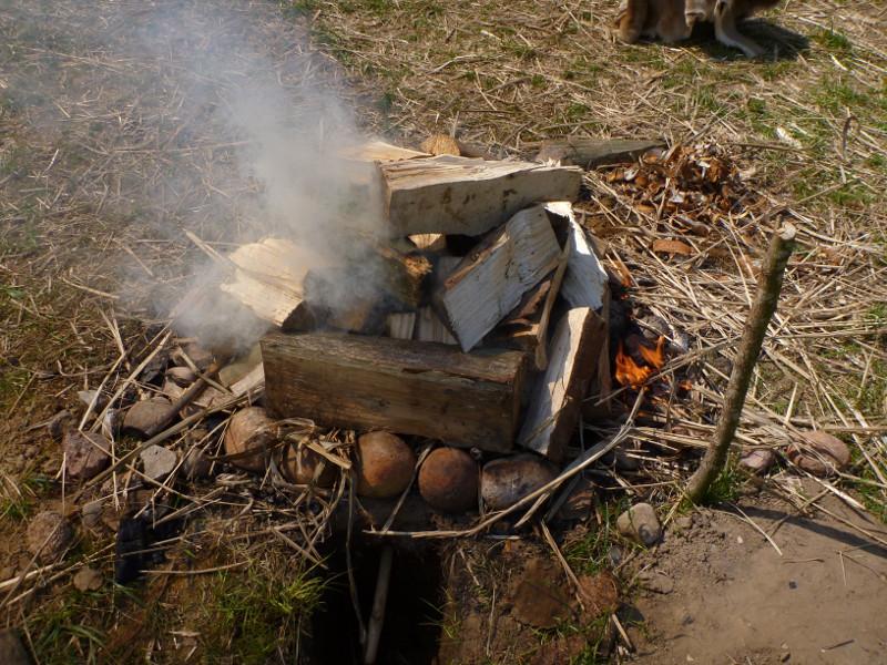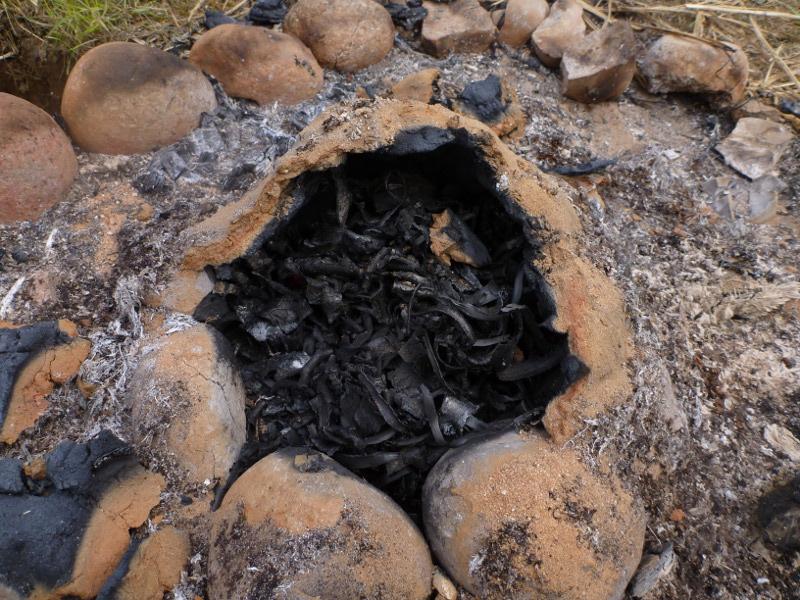 On top of this a big, hot fire, was made, which he fired for about 2 to 3 hours. After letting the fire burn down, the pit was allowed to cool down for at least one hour, sometimes much more, to prevent the heat inside creating a fire when coming in contact with oxygen.