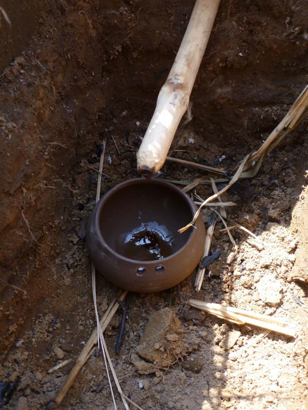 The clay pot turned red while firing and after cooling down it was well burnt. When tapping it with a fingertip it gave a high tone, which indicates a well-done clay pot. This suggests high temperatures were reached during firing. Interestingly, the colour of the pot outside is reddish to light brownish, but inside is completely black indicating a burning process without oxygen.
