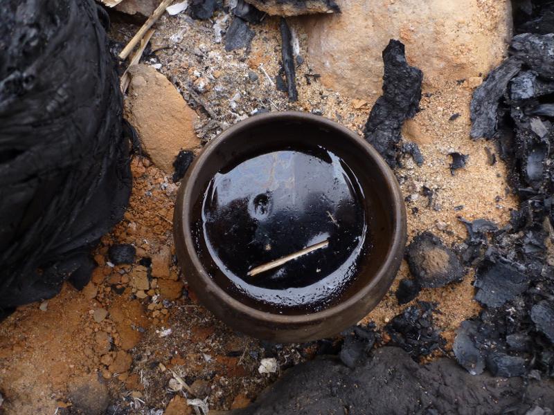 The vessel was then put close by or above a fire or hot embers so that the fluid evaporated and left a little bit of black, sticky pitch.