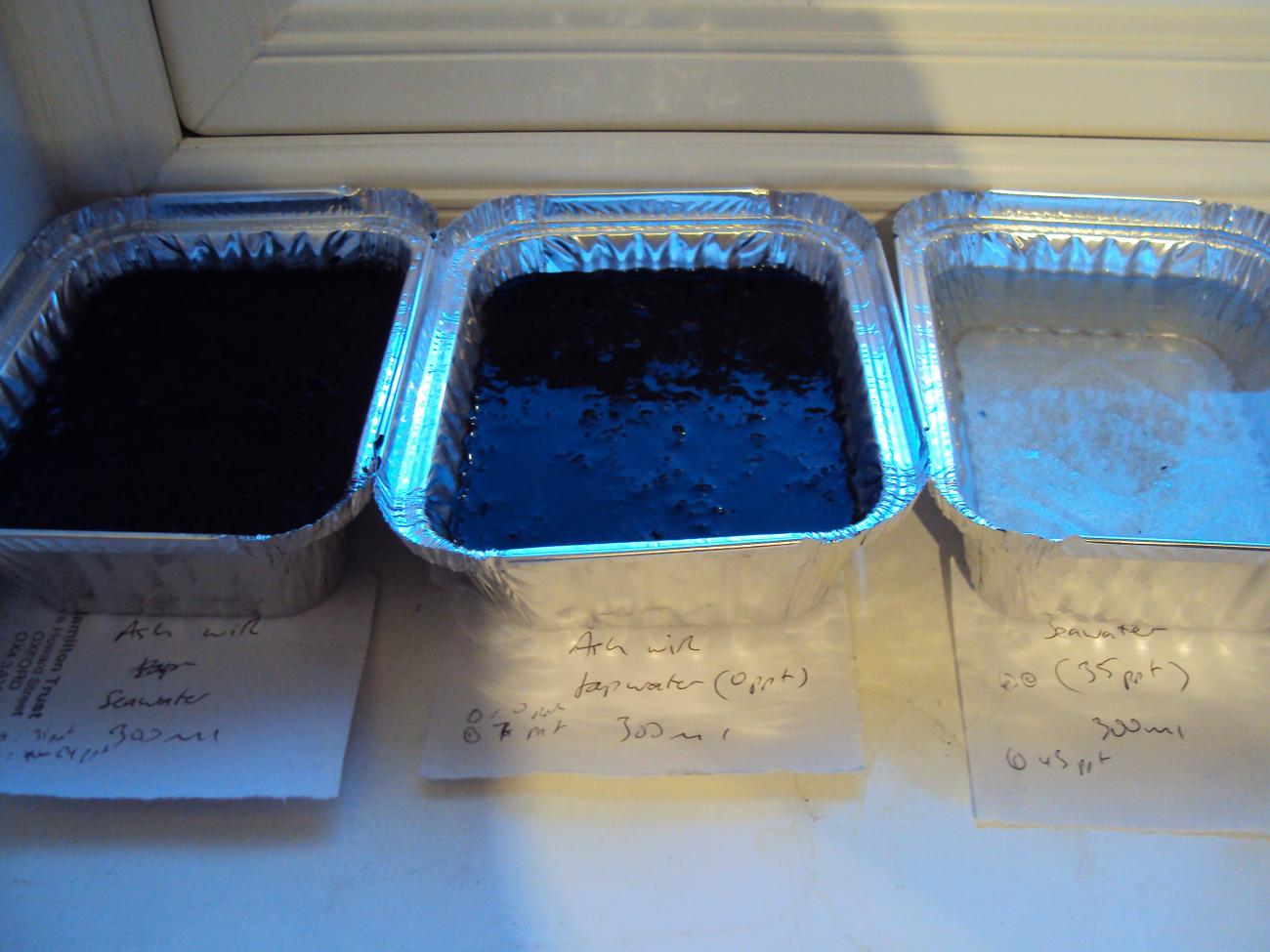 I took three foil trays and in one (tray 1) I poured 300 ml of seawater. In tray 2, I mixed 2 g of samphire ash with 300 ml of saltwater. In tray 3, I mixed 2 g of ash with 300 ml household tap water. I placed all three trays on an internal window sill, which received light and heat through the window panes, but excluded air (See Figure 1). The order of the trays on the sill were regularly rotated in order to ensure that the trays were exposed to roughly identical ambient conditions. At approximate 24 hour intervals, I measured the salinity of water within each tray using the refractometer, which was calibrated daily using purified water and was accurate to 1 ppt. Six readings were taken for each tray were taken in total. After standing for a week, the volume of the brine from trays 1, 2 and 3 was measured (the brine in tray 2 was filtered to remove the ash) and the brine heated in a saucepan to evaporate the liquid.