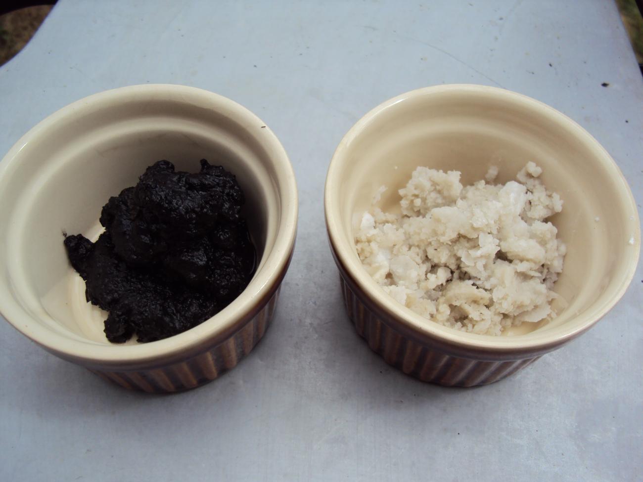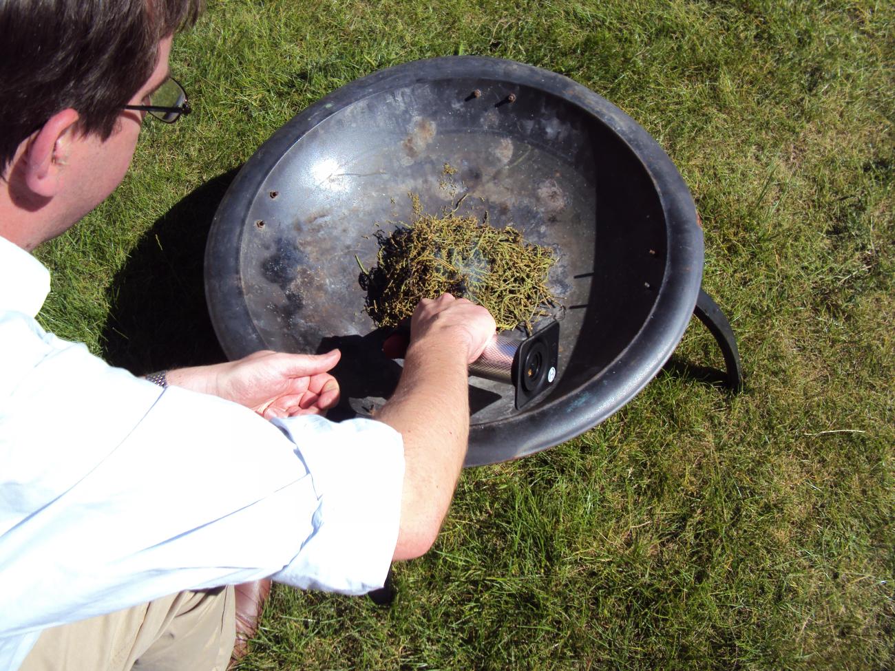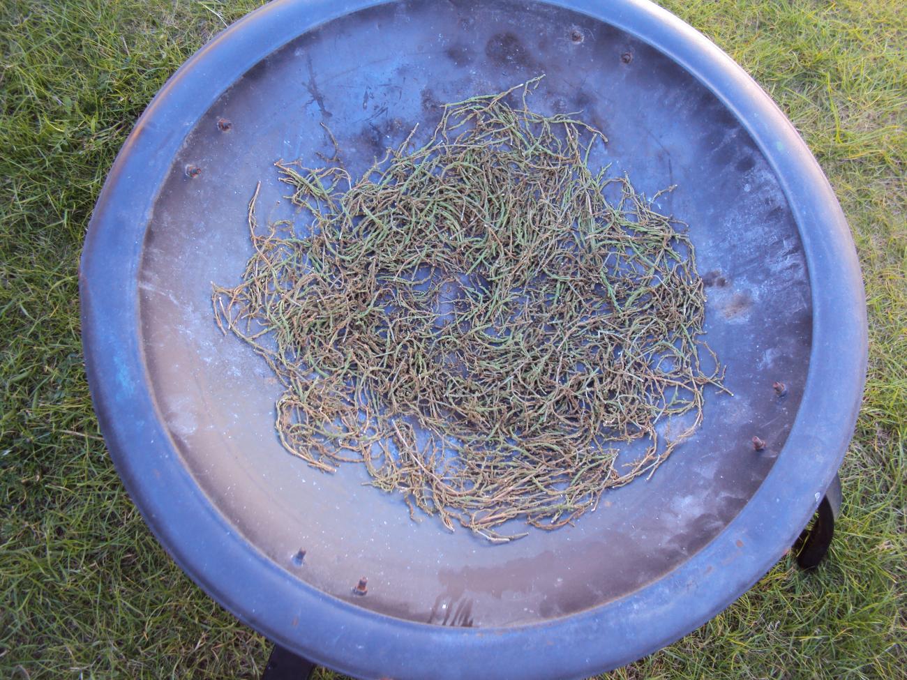 I began my experiment in October 2014 with 100 g of fresh samphire (Salicornia europaea). The commercially available plant was easier to source than sea rush and other wild plants, and while the plant is usually found in the lower saltmarsh (including in Essex), glasswort, which is biologically identical to samphire, was identified in fuel ash deposits and had therefore been utilised by the Iron Age and Roman salters. I dried the green samphire sprigs in the open air over a period of about seven days, by which time the sprigs had turned brown and had become shrivelled with the loss of moisture. The weight of the dried plant was 30 g. To produce the ash, I burnt the dried samphire in a garden fire-bowl with a kitchen blowtorch, resulting in a pile of charred strands and powder weighing 4 g.