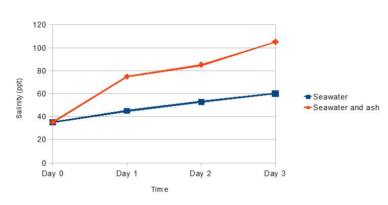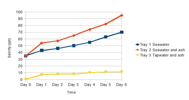 The readings are shown in Figure 2. The brine in tray 1 (seawater only) gained in salinity over the week, doubling from 35 ppt to 70 ppt, an increase of 100%. Conversely, the volume of liquid had halved from 300 ml to 150 ml. The salinity of the brine in tray 2 (ash and seawater) rose more dramatically from 35 ppt to 95 ppt, an increase of 171%. Meanwhile, the volume of brine reduced from 300 ml to approximately 120 ml. In tray 3, the tap water, which had a salinity reading of 0 ppt, gained salinity with the addition of ash, the level of salt increasing from 0 ppt to 11 ppt.