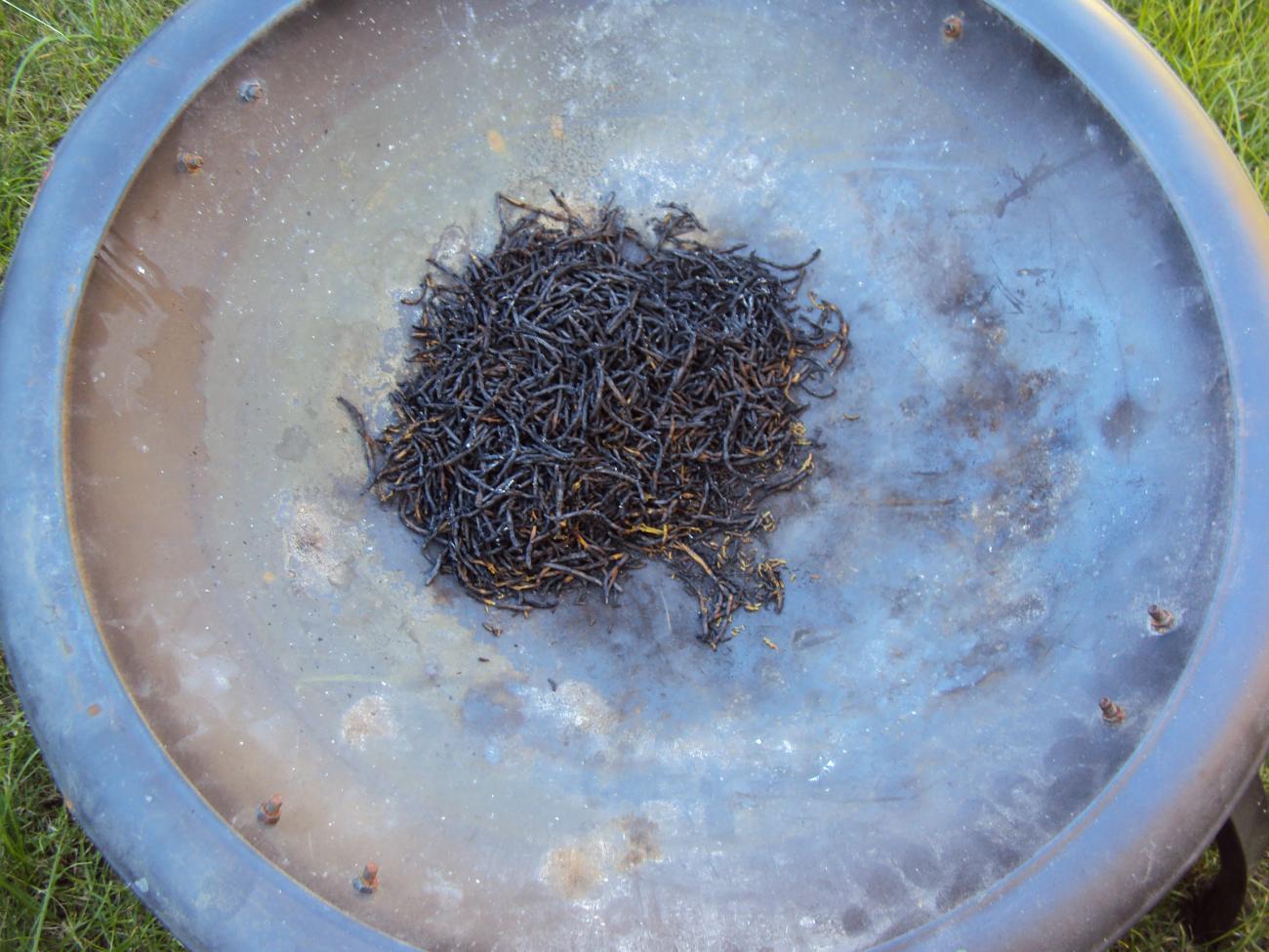 To clarify these matters, the experiment was repeated, this time outdoors in July 2015 using higher quantities of ash and seawater. The method was identical to that for the first experiment, except that the conditions of the second experiment were adapted to better mimic the open conditions of the Iron Age and Roman salters. Raw samphire, this time 450 g, was dried outdoors for three days (in temperatures reaching circa 21ÂşC), by which time the sprigs had browned and reduced in weight to 76 g (See Figures 3 and 4). The samphire was burnt to ash, which reduced the weight further to 38 g (See Figures 5 and 6). The ash was placed in a foil tray and mixed with 1000 ml of seawater at 35 ppt. A second tray contained 1000 ml seawater only. Both trays stood outside during the day (during a heat wave, with temperatures reaching circa 35ÂşC) and indoors during the night (See Figure 7). After three days, the salinity of the brine in the tray containing seawater alone reached 60 ppt, an increase of 71% (See Figure 8). The salinity of the brine from the ash-steeped seawater reached 105 ppt, an increase of 200%. (This stage of the experiment could not continue to the six days of the first experiment, because the salinity of the ash-steeped brine had by three days exceeded the scale of the salinity meter.) The total volume of the ash-steeped brine was 400ml; that for the seawater alone was 550 ml, but only 400 ml of this was taken to be evaporated. The brine from both trays was then evaporated together on a gas-fired barbecue (See Figure 9). After 1.5 hours, the seawater brine had fully evaporated, leaving 44 g of crystallised salt. After 2 hours 10 minutes, the ash-steeped brine had evaporated, resulting in 70 ml of salt, although the salt differed in appearance, being black and finer (See Figure 10). After six hours, when the salt from both brines had dried completely, the respective weights were 36 g and 64 g.