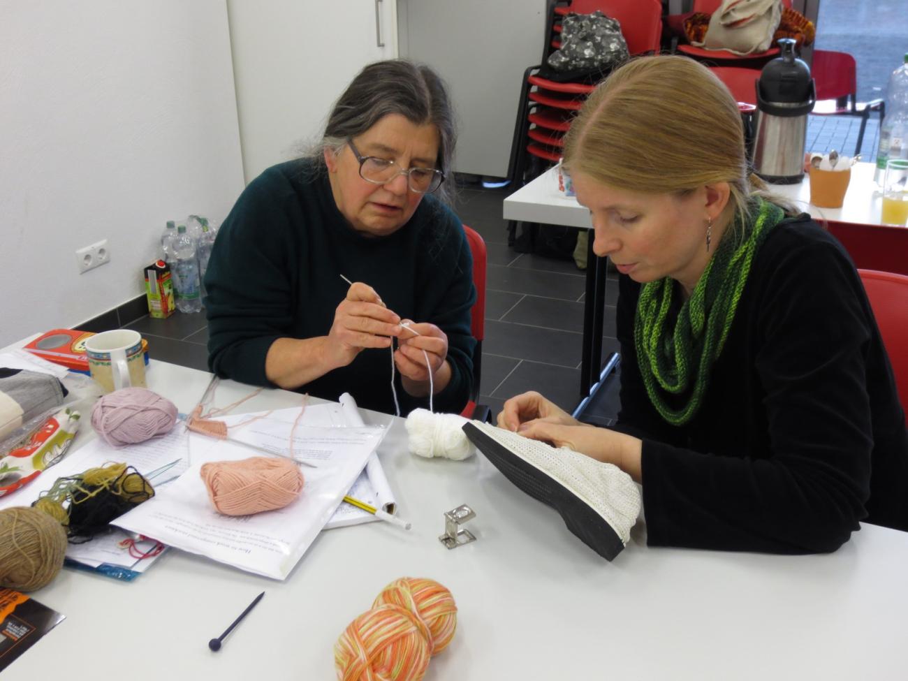 Micky Schoelzke and Ruth MacGregor presented a practical history of silk manufacture, including a hands-on workshop in de-gumming cocoons and reeling silk. Without practical experience, it is not always possible to fully understand a technique, including its advantages, limitations and the time it takes, and therefore, this was a very informative session. Jane Malcolm-Davies explored knitted caps and the development of knitting in the early modern era. Some participants had volunteered to attempt to recreate caps before the conference, so there was comparison and discussion about their results. Aislinn Collins presented about felted caps in Ireland and invited delegates to join her in a felt-making workshop, with assistance from Sabine Ringenberg.