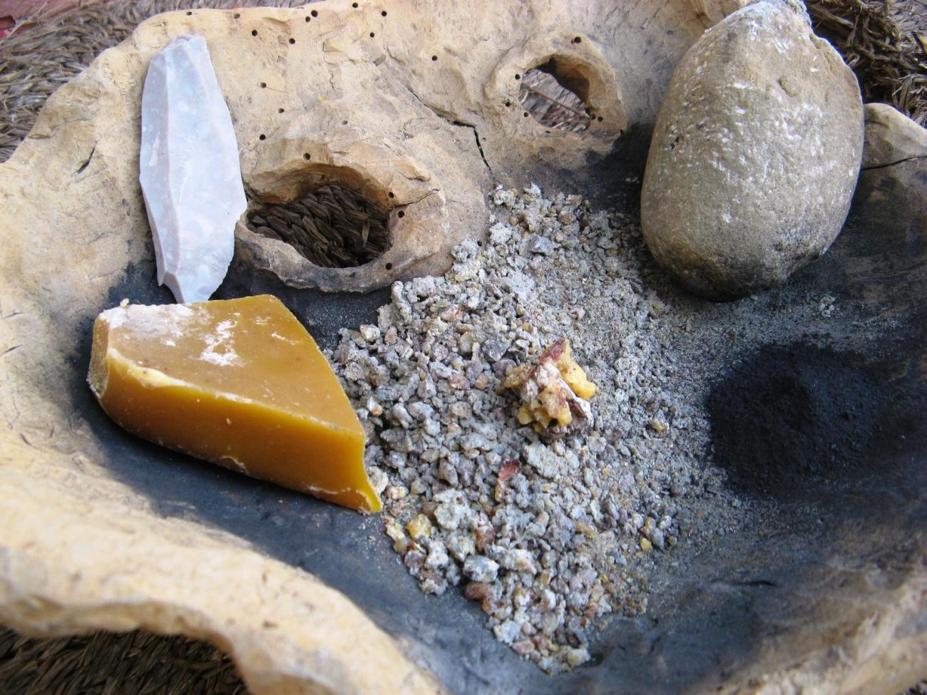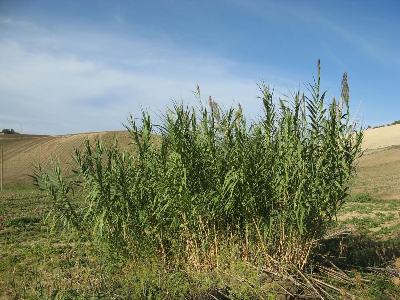 Gathering, drying and intertwining the Chamaerops humilis (dwarf palm) leafs and Ampelodesmos mauritanicus (a sort of endemic esparto) took several weeks to create the hundreds of metres of ropes required for construction (See Figure 8). Two to three metres-long Rubus ulmifolia (blackberry) branches were cut, stripped of leaves and thorns, and twined during the roof building process, in order to have them flexible enough (See Figure 9). Herbaceous plants were cut using two sickles made with flint blades glued onto handles manufactured from ash tree. Both lithic and bronze axes were used to collect raw plant materials. The glue was prepared by mixing molten pine resin, beeswax and wood ash in equal parts (See Figure 10). Several hundreds of Arundo donax (giant cane) and Phragmites australis (common reed) were gathered, selecting only those longer than 1.5 m and with a minimum diameter of 2/2.5 cm (See Figure 11). They were collected in the area surrounding Pietraperzia and along the Salso river banks, not far from the archaeological site. Some Arundo donax cut the previous year were used as well. The reeds were not processed: leaves were not removed as recommended by the traditional builders because of their water-proofing effects.