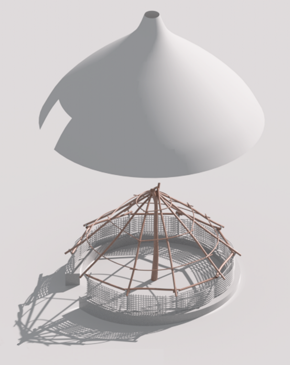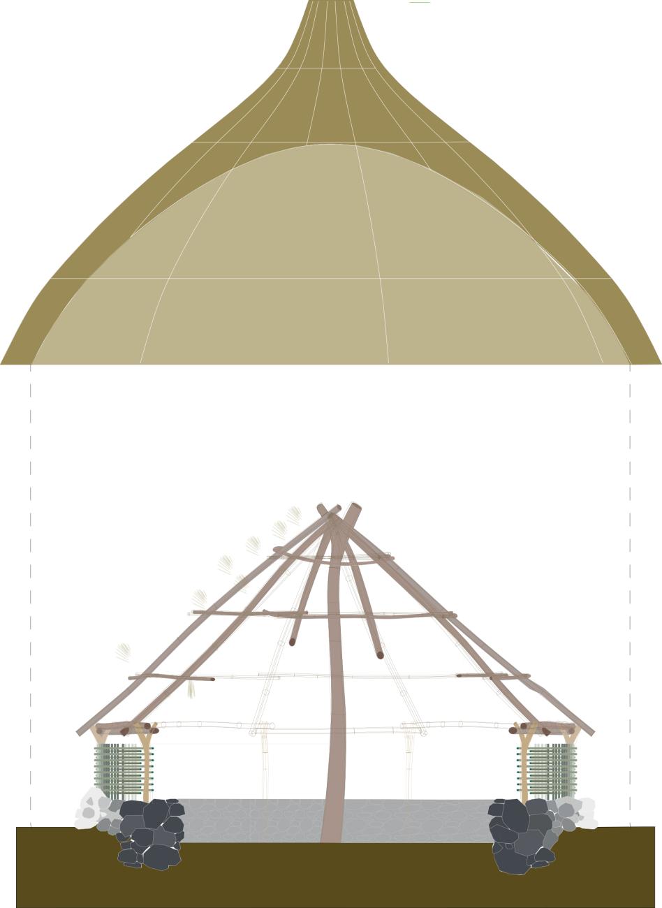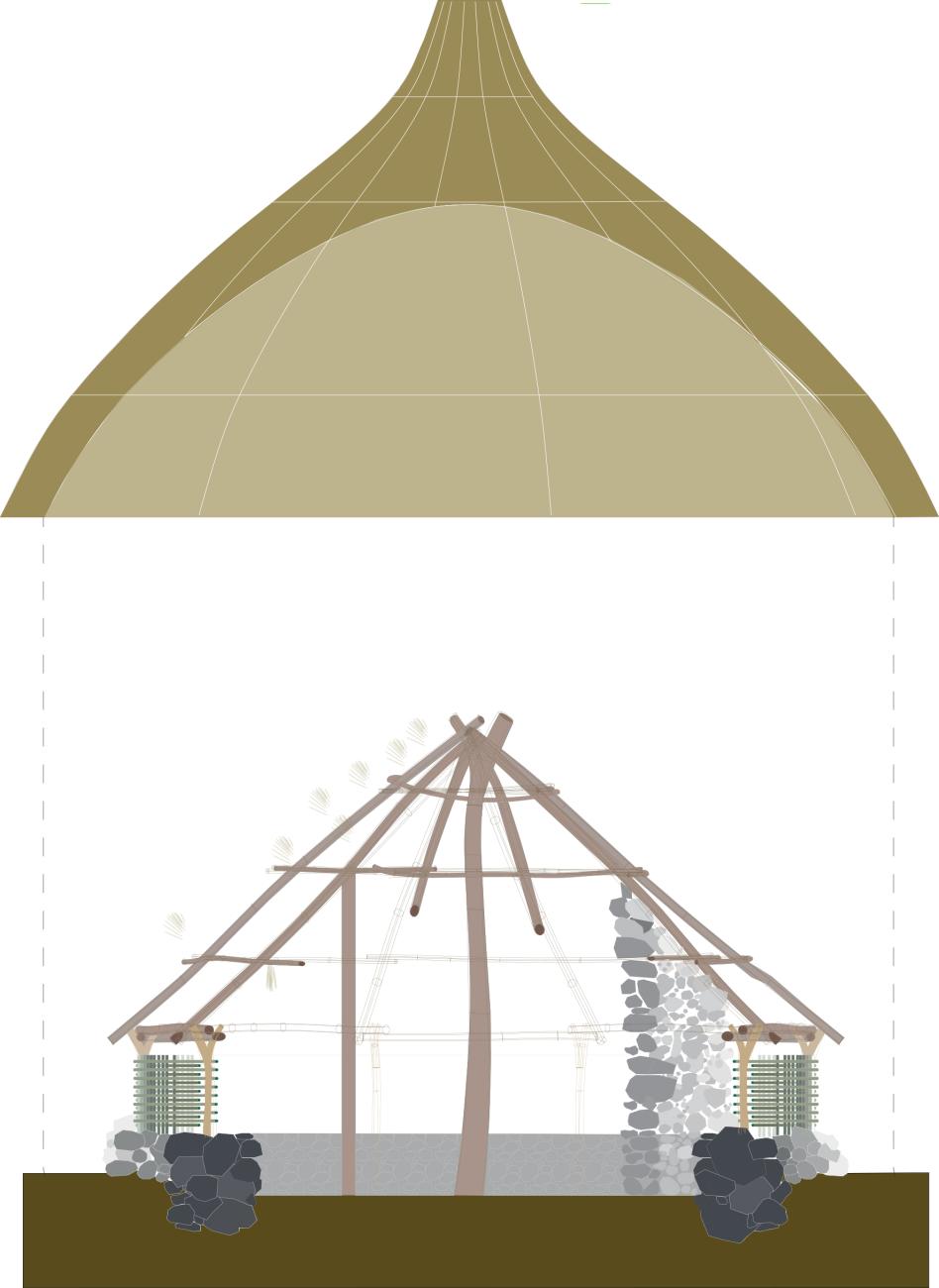 Some difficulties arose during the construction of the hut following the first hypothesis. As a matter of fact, the original 8m diameter of the structure would have hardly allowed to have a self-supporting roof—pagliari have an average 4-5 metres diameter. This uncertainty led to a variation of the hypothesis used by the previous reconstruction of the hut (See Figure 5c).