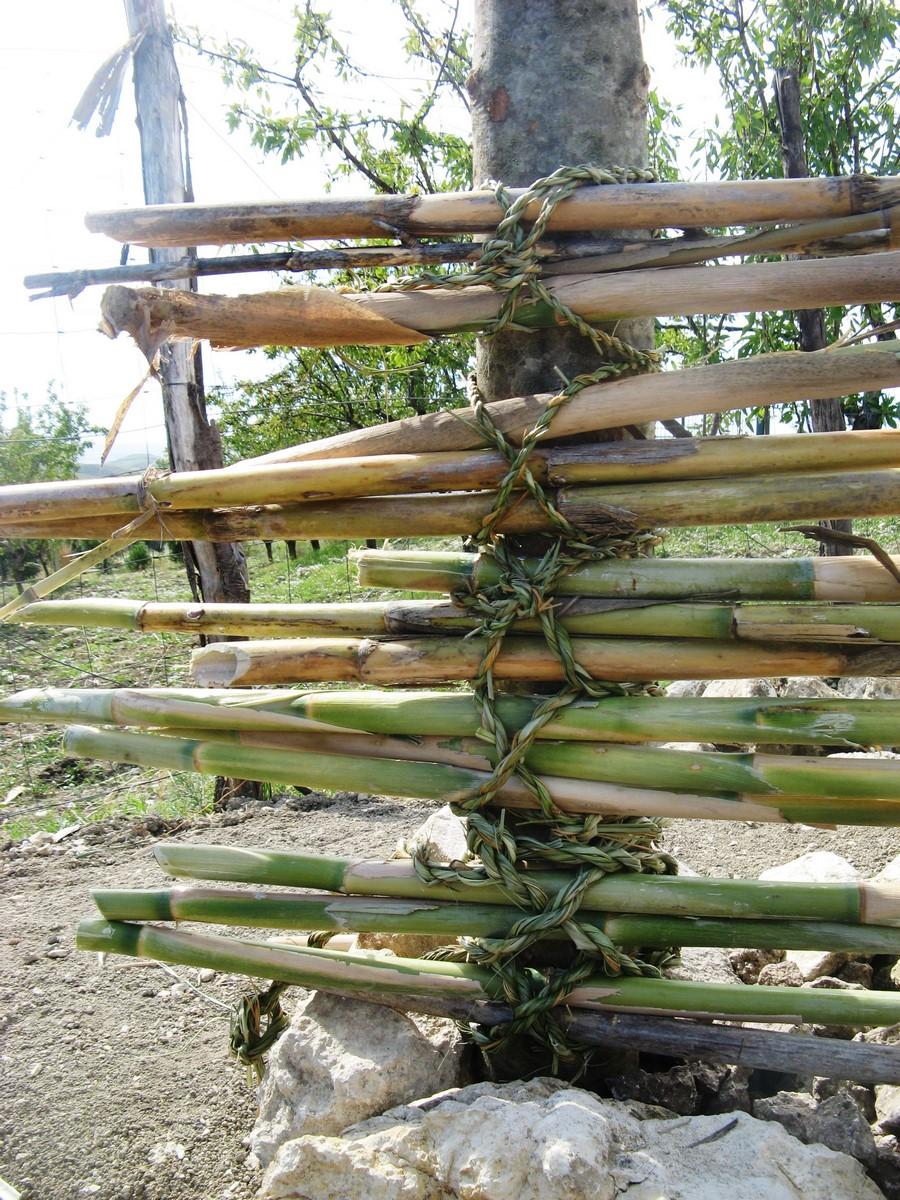 Day 14 required the efforts of 6 people to place the diagonal beams for the roof. Long ash tree branches were tied to the horizontal beams and the vertical posts, and then gathered all together at the roof peak (See Figures 24-25). Thinner branches and some cut in half longitudinally were tied horizontally to them in order to support the rest of the roof (See Figure 26).