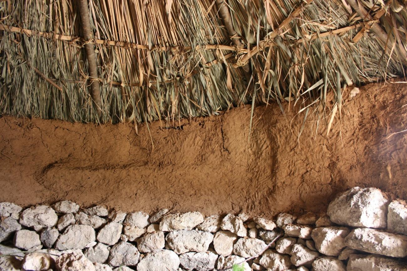 The last activity, which also required the highest possible number of people in a ‘hand-made’ experience, was the internal wall daubing. As the reeds were long enough to protect the majority of the wall, daub was spread only inside, to fill the spaces in the reeds (See Figure 33). The daub was kneaded next to the hut, and then put on the wall with the help of about ten people during one morning (See Figure 34). About 1 m2 was left undaubed to allow observation of the wall framing construction.
