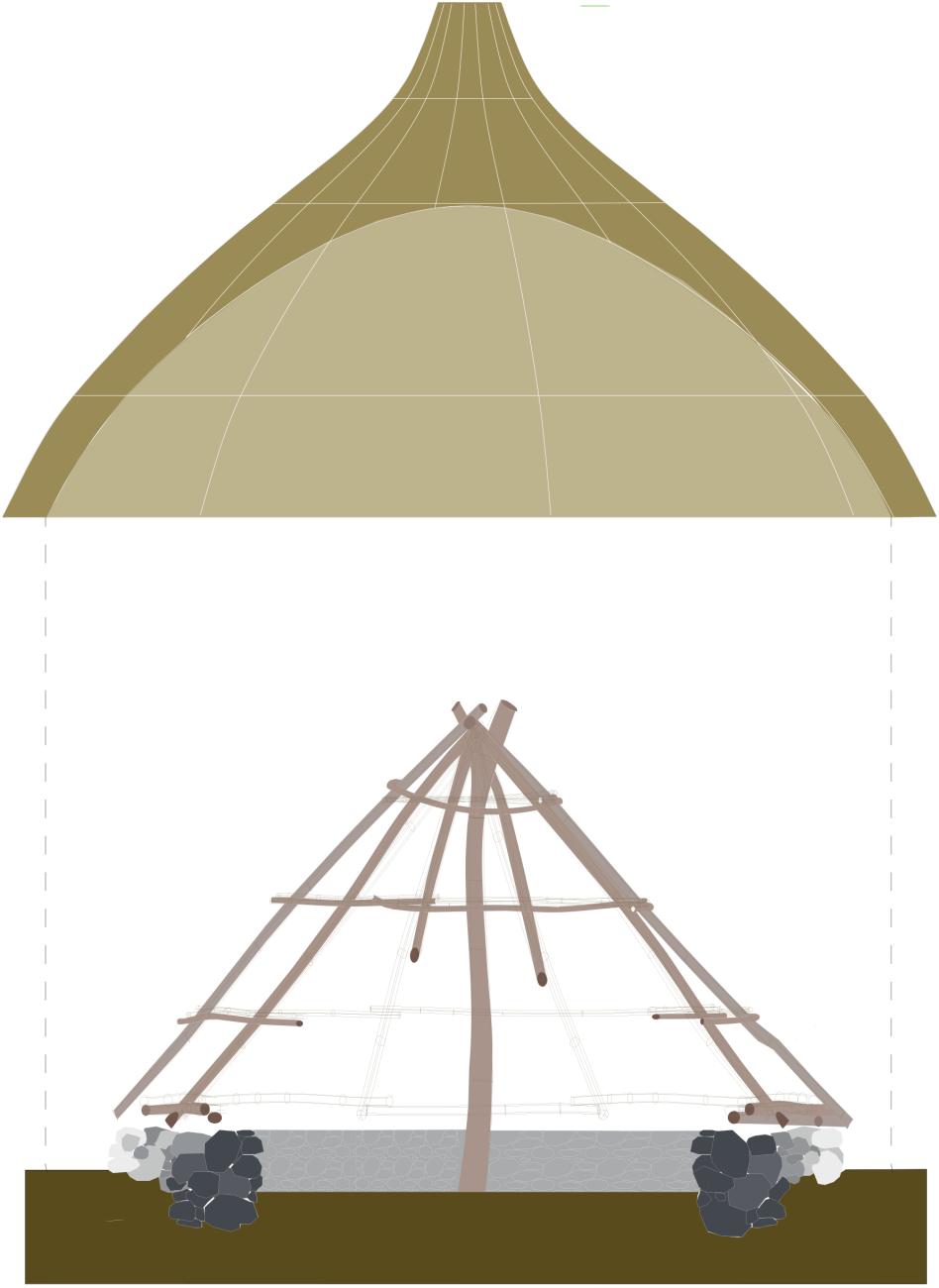 Comparing archaeological data with those obtained by ethnographic research allowed us to create reconstruction hypotheses. Unfortunately, the archaeological contexts provide little information on the composition of the roof; it always represents the most arbitrary portion of restoration activities. For this reconstruction, comparisons with known reconstructions associated with the prehistory of Southern Italy and Sicily were applied. In addition, techniques known from the ethnographic study of Sicilian pagliari, particularly in the context of the Madonie Mountains (Palermo), were incorporated. In order to have a reference model, and to test at least one of the reconstruction propositions, a model was built on a 1:2 scalefrom the archaeological remains of Hut 1 of Tornambè. In the first hypothesis, the preserved perimeter wall comprises only the lower part of the elevation, the middle element is made with smaller stones, and then the upper element consists of perishable items (wooden poles and reeds or other vegetal materials). The probable post holes between the two faces of the wall allowed us to assume the presence of posts set vertically to support the roof. With this, transverse rafters join at the roof peak, supporting each other. The initial interpretation of the post-hole placement suggests the three internal posts were not considered structural, due to the lack of symmetry in their arrangement. They may have been used for support of a mezzanine floor, and supported symmetrically by the internal wall (See Figure 5a).
