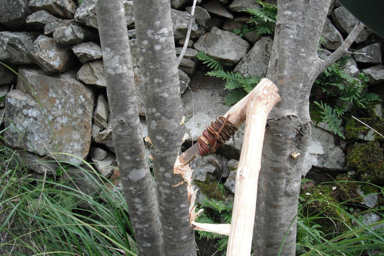 Before the official beginning of the building process, several preliminary activities were conducted. The archaeological model is built with local limestone, so a large supply of stones (with different dimensions) used for the wall construction was collected in a radius of about 1.5 km. The other main activity was the selection and harvest of trees required for the posts and beams (it happened on day 5 of the building). As no archaeobotanical data are available for the hut posts of the archaeological model, Fraxinus ornus) (ash tree) was chosen for the construction of the wooden frame of the hut (posts, beams, rafters), and for the manufacture of the tool handles (sickles, axes). Elastic and durable, ash tree wood was used in Sicily in the past for the construction of pagliari, and it has been identified in Sicilian pollen sequences (Sadori et al. 2013). Individual trees were selected for the straightness of their trunks, minimum diameter of 10 cm, and the possibility to have a fork at the top (See Figures 6-7). About 15-20 long thin branches were also collected to be used as roof elements.
