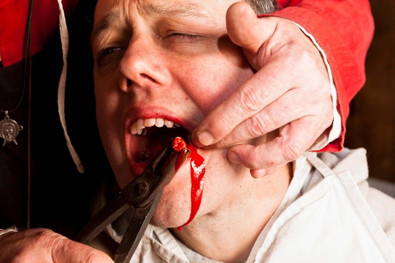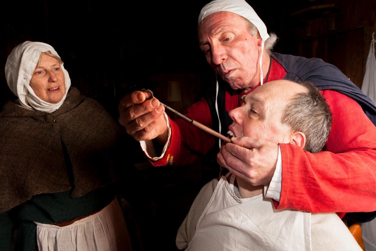 It is the year 1350 in Gravendam, the medieval town of Archaeological Open-air Museum (AOAM) Archeon in the Netherlands. There is a great deal of commotion on the street when the master cabinetmaker, John, screams out in pain and despair caused by a cavity in one of his molars. The sound of his scream is heard by everyone! His wife, Marte, tries to reassure him, at the same time scolding him for not going to see the barber surgeon, Master William, sooner. She pushes him into the workshop of Master William, who is ready to examine the poor patient. A crowd has gathered outside the workshop, all curious to see what horrific scenes are about to take place.