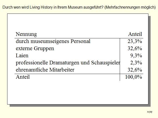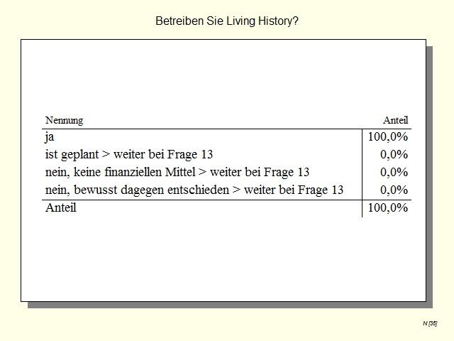 The study has shown conclusively that Living History is a topical issue and is a method that is widely used in German archaeological open-air museums. At the same time there is also the need to act with respect to quality control to ensure that intangible cultural heritage is experienced through Living History in a professional manner, thus protecting the practice. The survey serves to investigate the point at which archaeological open-air museums in Germany are with regard to Living History.