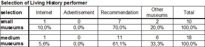 In summary, it can be stated that the size of a museum influences the following factors: how many events are offered, the number of employees available, the number of forms of Living History per museum, and to a lesser extent on how the Living History performers are selected, as well as whether the performers are trained, and finally on the number of occasions (quantity) in which Living History is offered per museum.