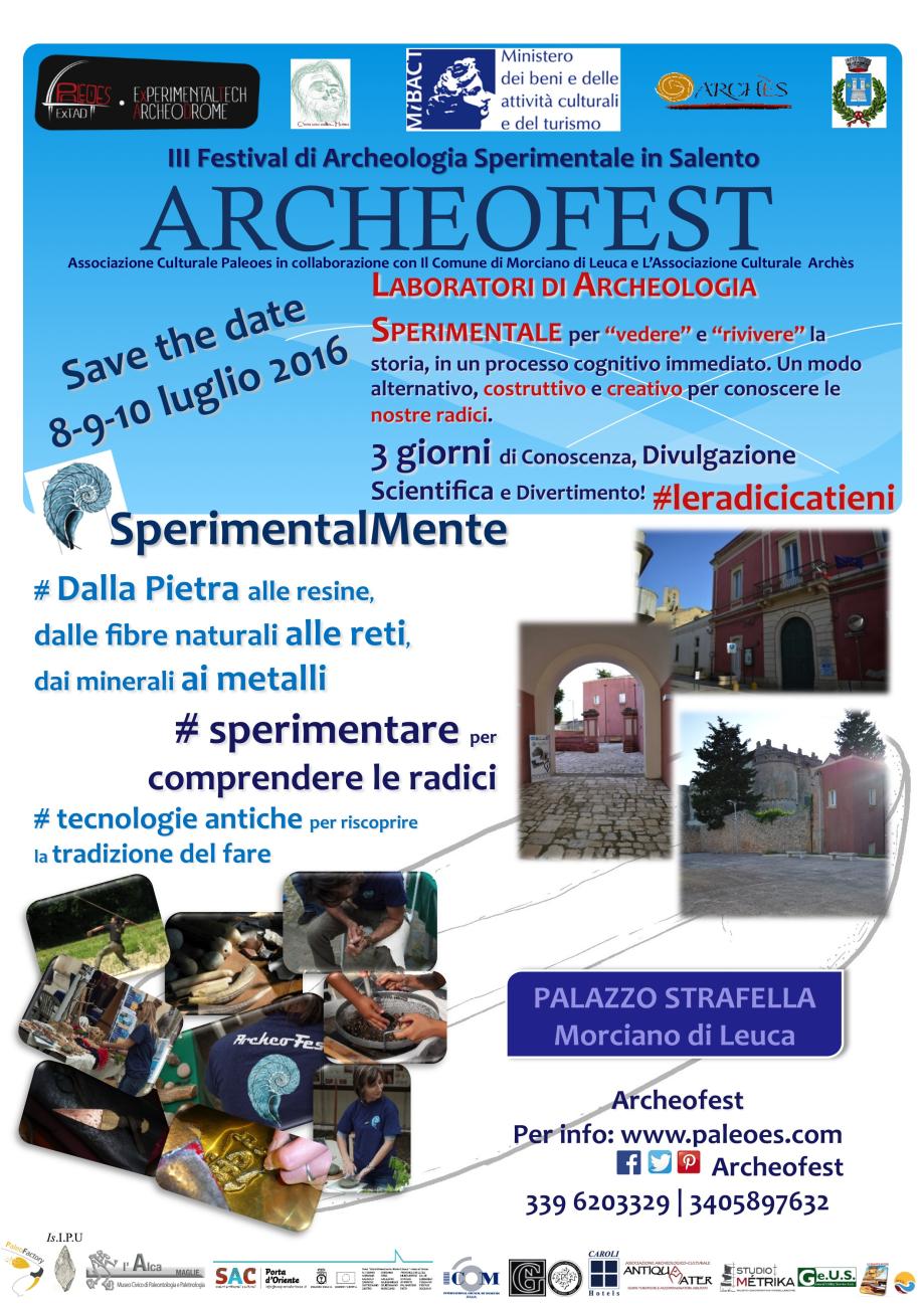 The third salentina edition of Archeofest was held between the 8 - 10th July 2016, and took place in prestigious Strafella palace, Morciano di Leuca, (Salento, Italy). This edition was heldi n collaboration with the town hall of Morciano di Leuca, the Cultural Association Archès and other cultural partners (See Figure 1).