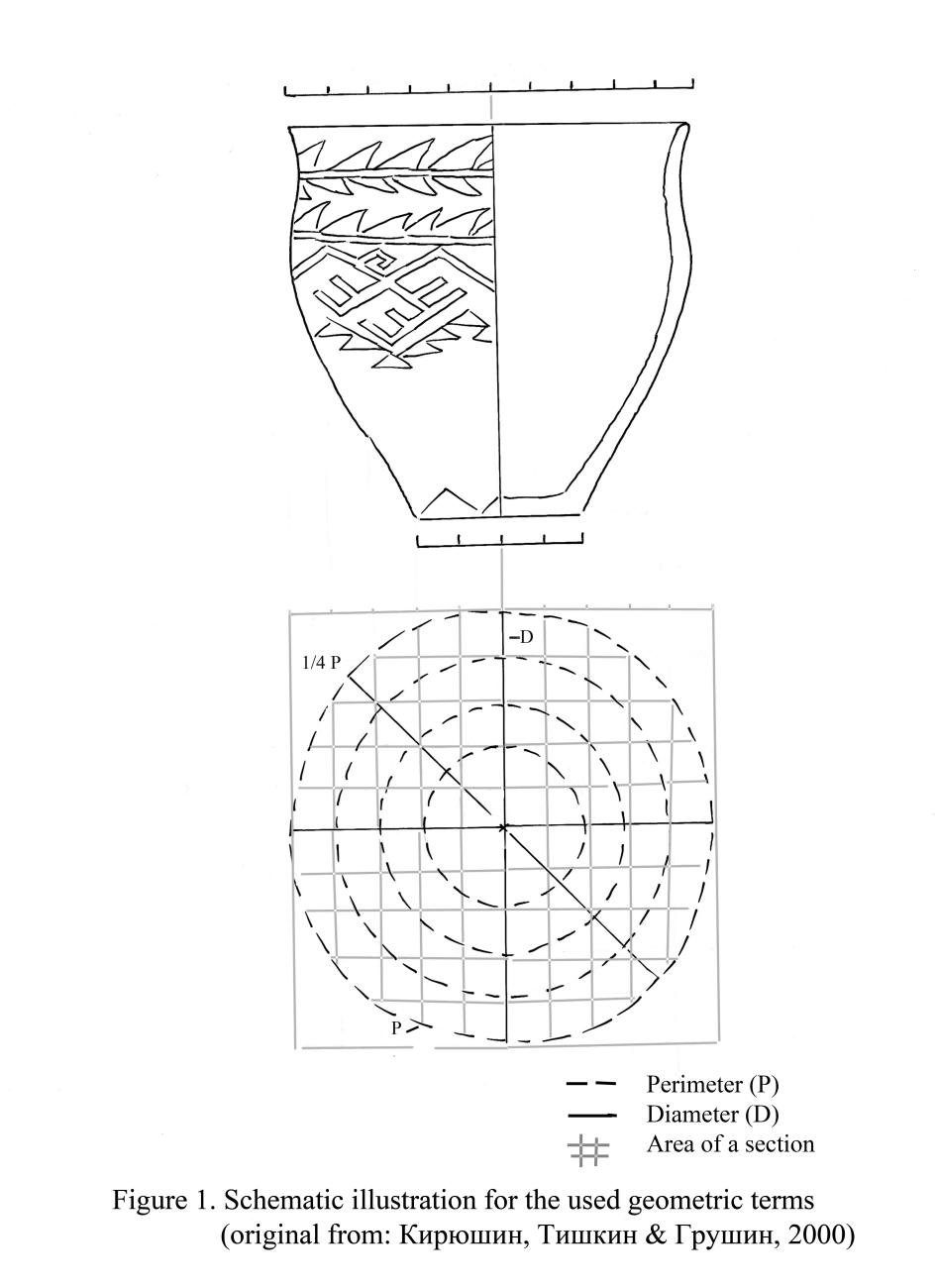 In the literature it was assumed that ornamentation could use some sort of preliminary sketches (Бобров& Михайлов1989). This hypothetical assumption can be quite real if the draft was executed for a part of the vessel’s surface. As supplementary material to this, it is also possible to use the image of the “pyramid” pattern (triangle chart) that shows the area of the horizontal section and related perimeter; these may be estimated by different units and the smaller the partition the larger the virtual area.